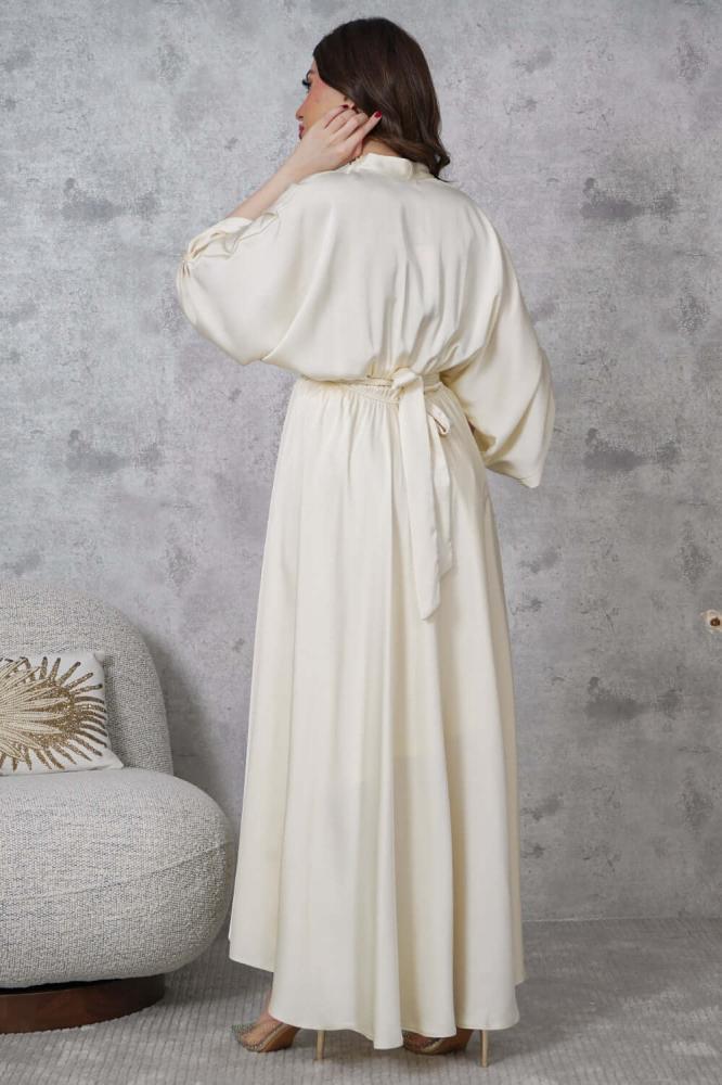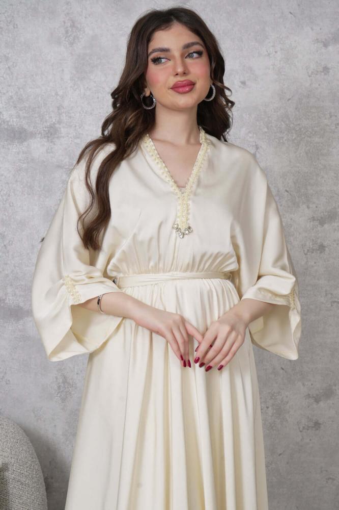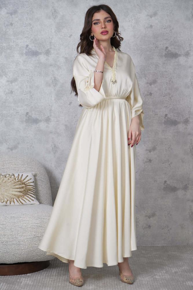 - نوع التصميم: فستان ماكسي بياقة مزينة بخرز