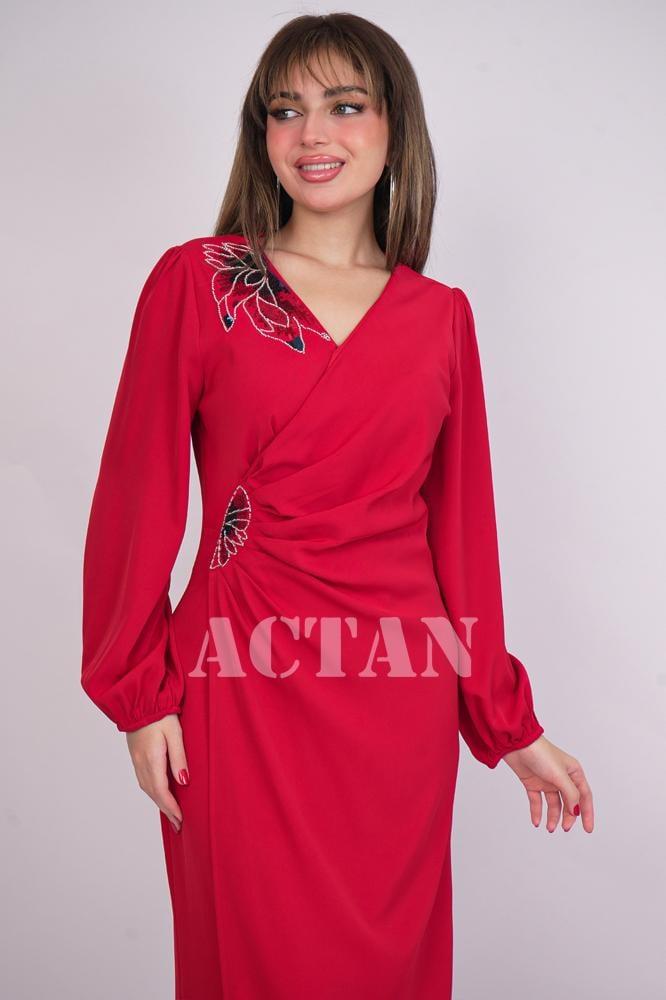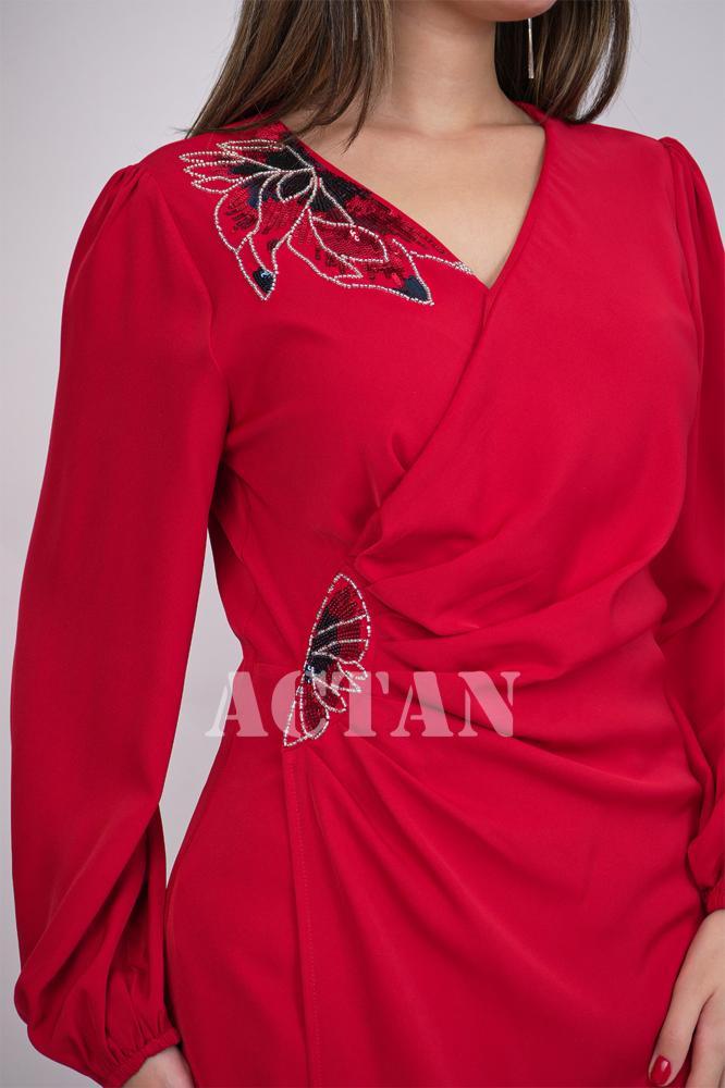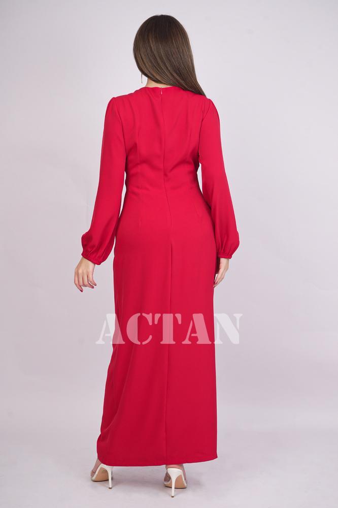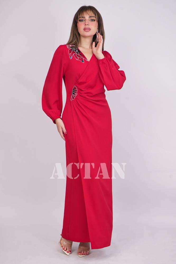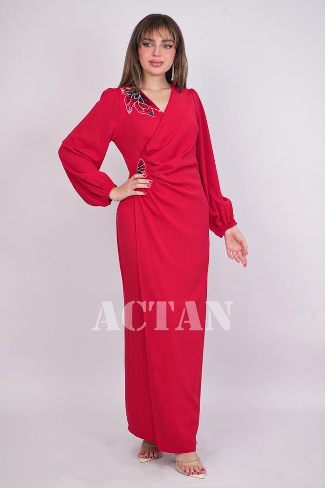 - نوع القصة: فستان ماكسي درابيه مزين بترتر، بأكمام طويلة وياقة V