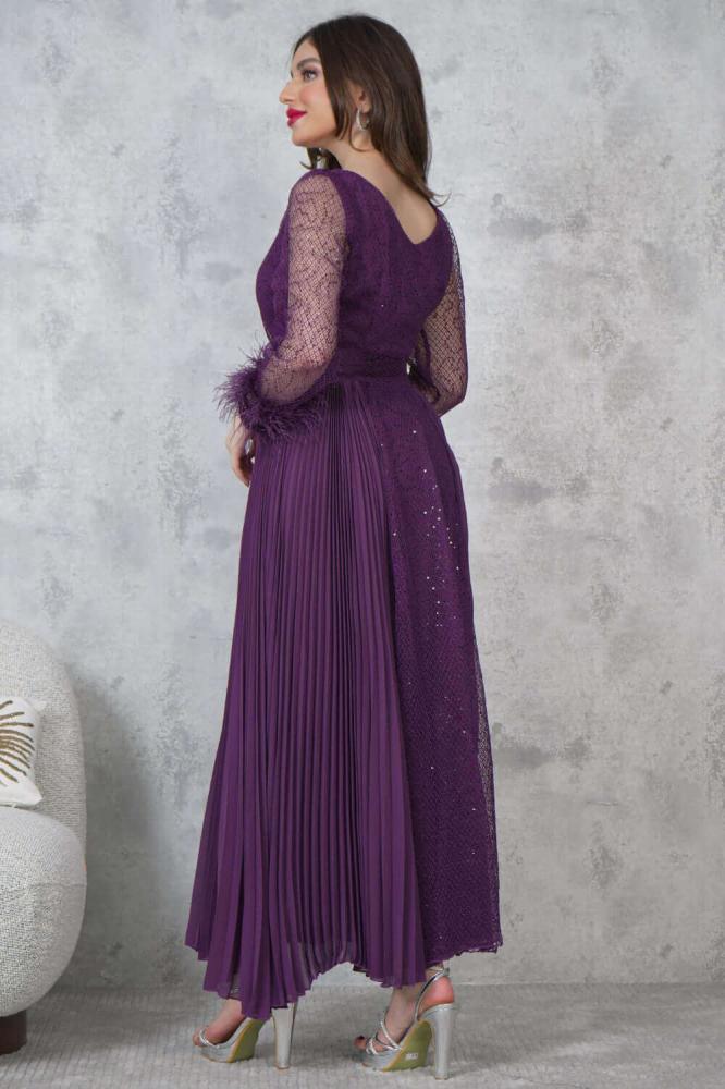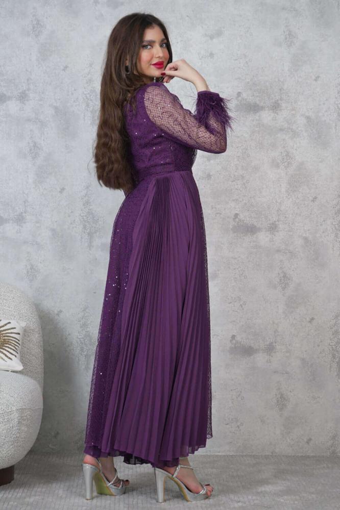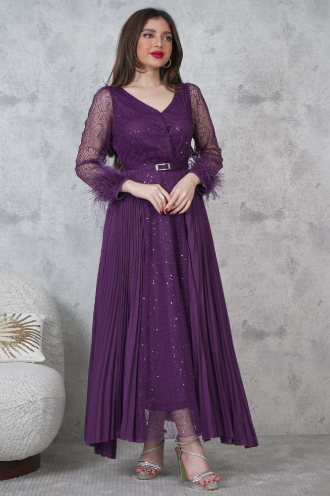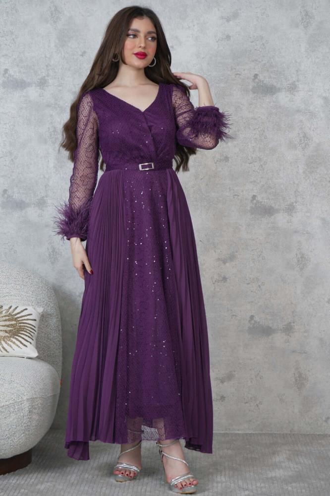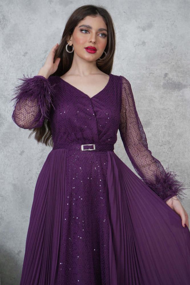 - نوع القصة: فستان ماكسي مزين بالترتر مع أكمام شفافة مزينة بالريش