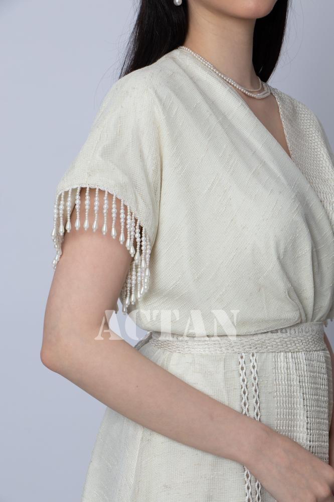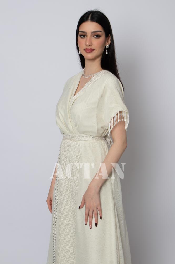- نوع القصة: فستان ماكسي مزين بهدب لؤلؤ مع حزام