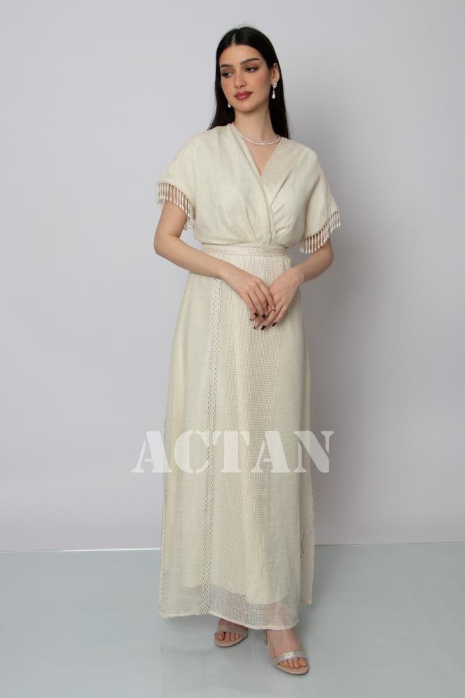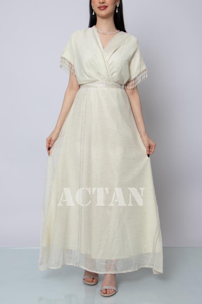 - نوع التصميم: فستان ماكسي مزين بهدب لؤلؤ