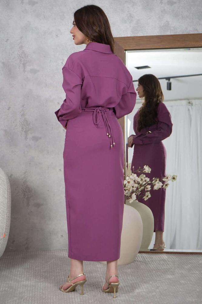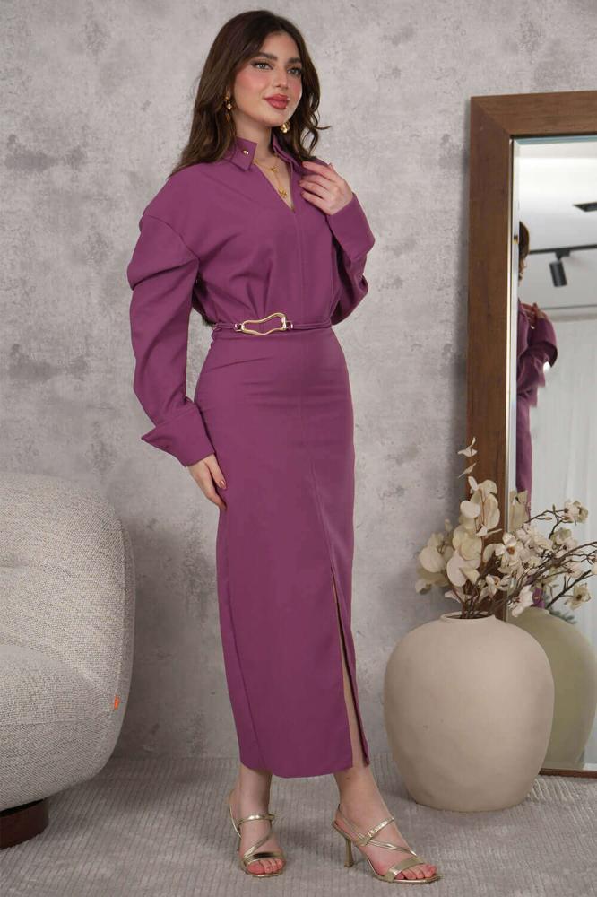 - نوع القصة: فستان ميدي أنيق بفتحة من الأمام وحزام