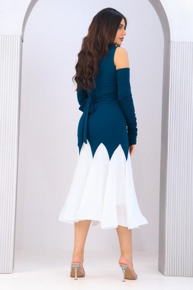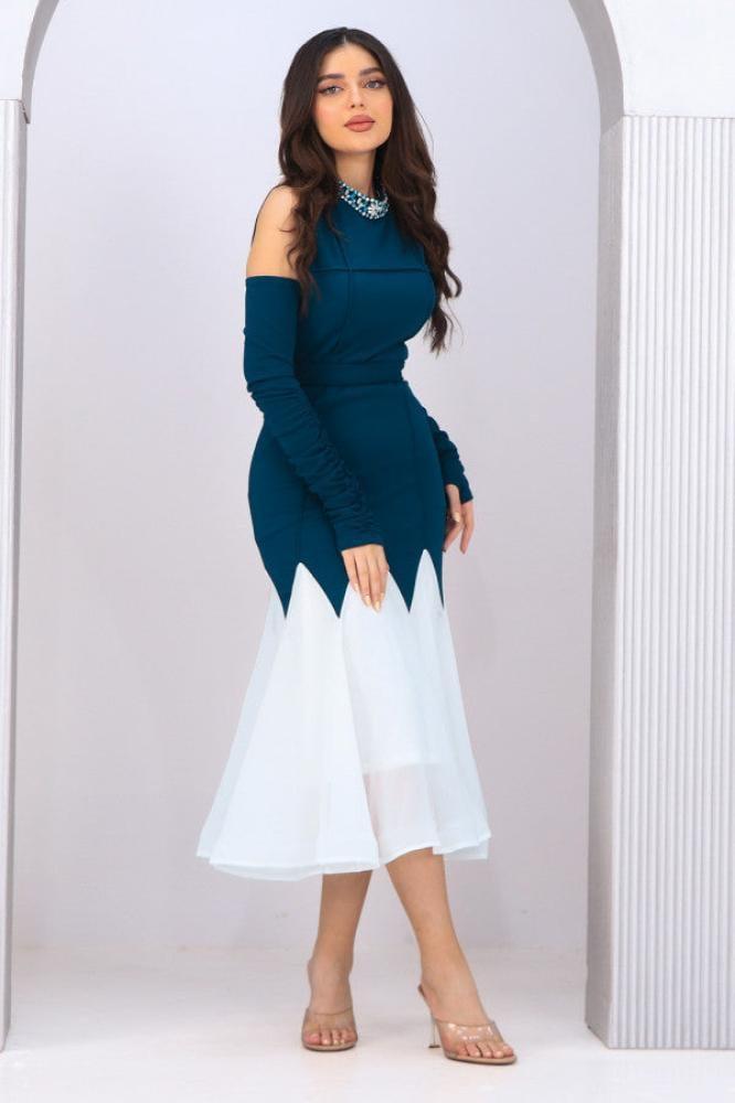 - نوع التصميم: فستان ميدي بأكمام منفصلة وكتف مكشوف