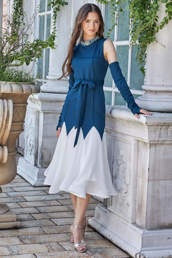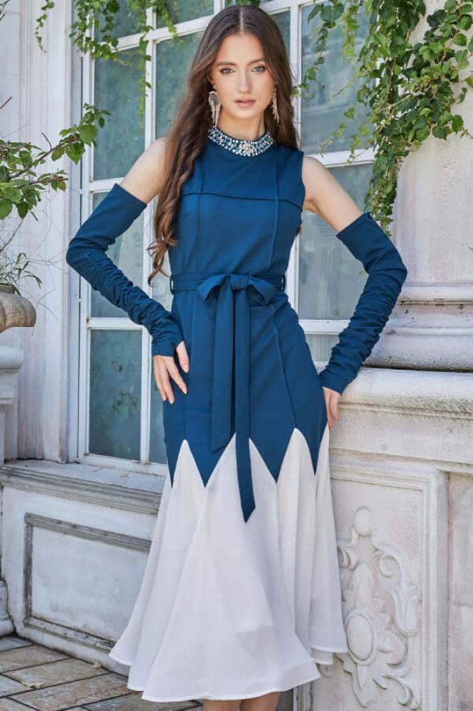 - نوع القصة: ميدي بتصميم شوقر بحزام على الخصر، وياقة عالية مطرزة، بأكمام منفصلة وكتف مكشوف