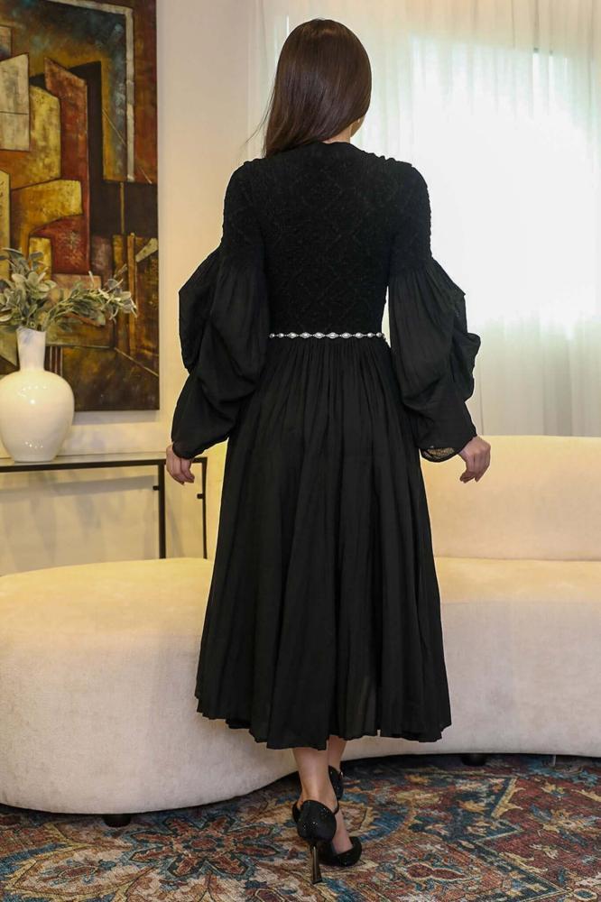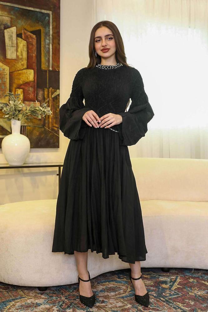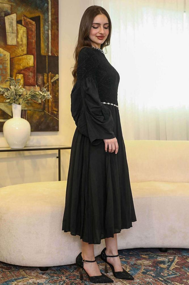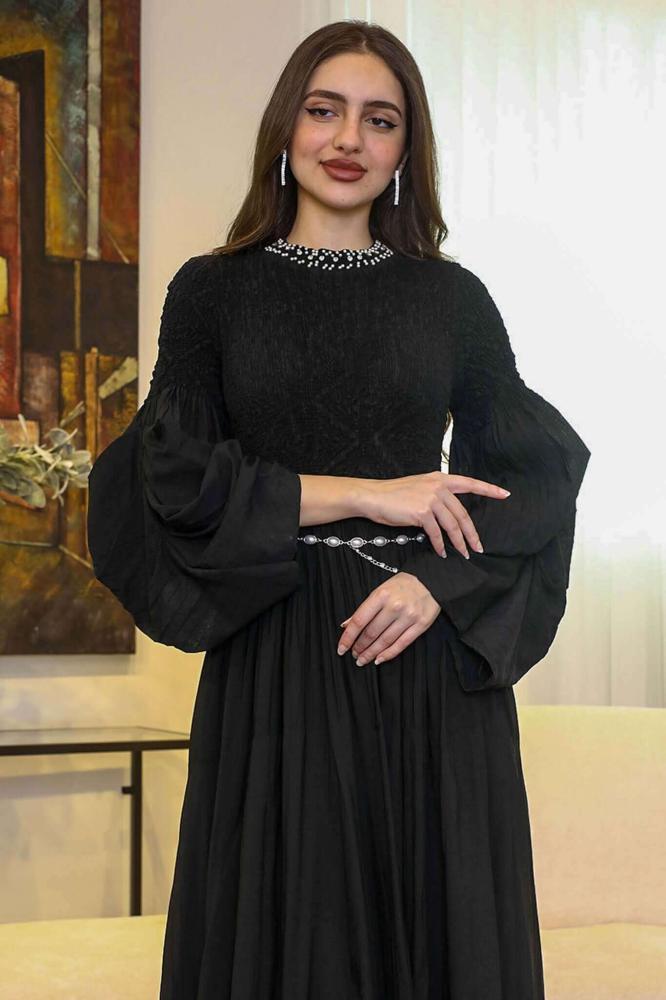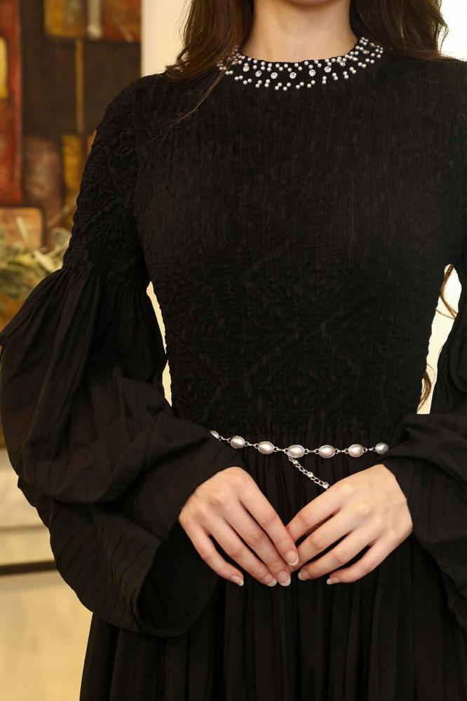 - نوع القصة: فستان ميدي بحزام سلسلة مزين باللؤلؤ بأكمام طويلة وياقة مزينة