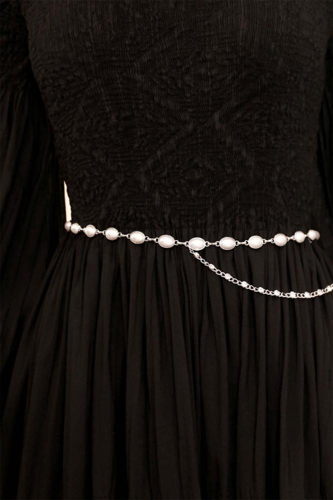 - نوع التصميم: فستان ميدي بحزام سلسلة مزين باللؤلؤ