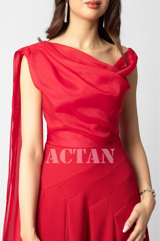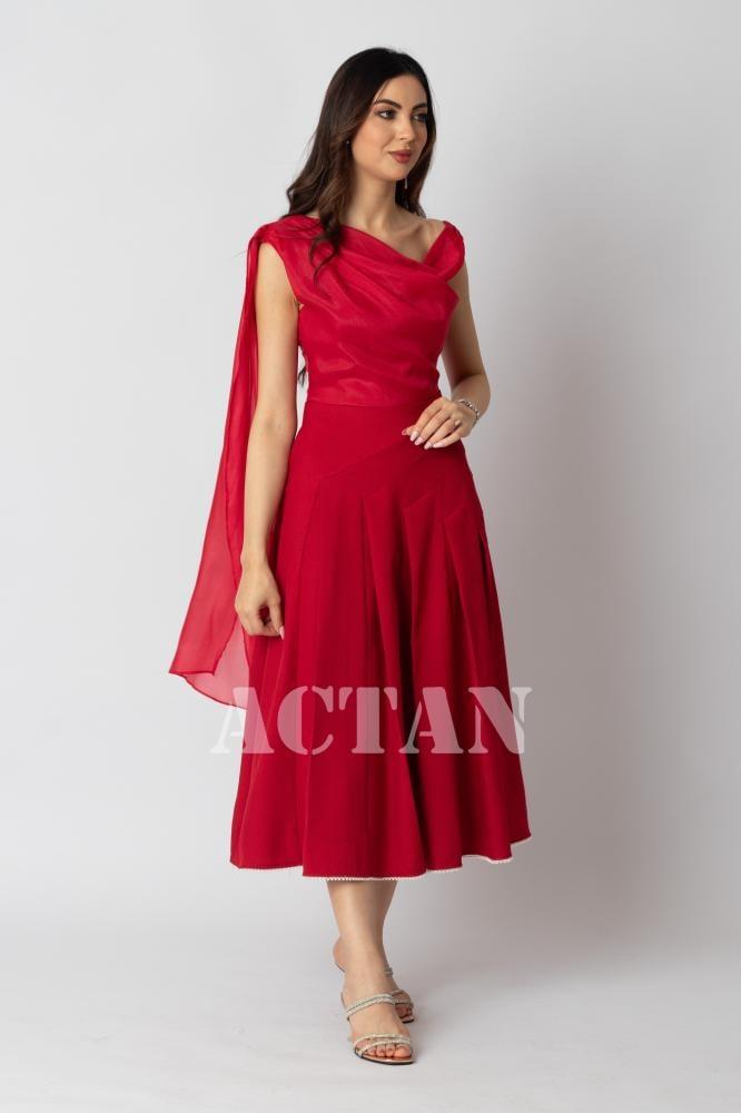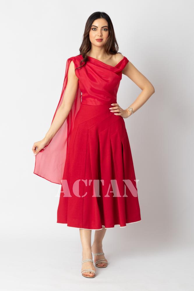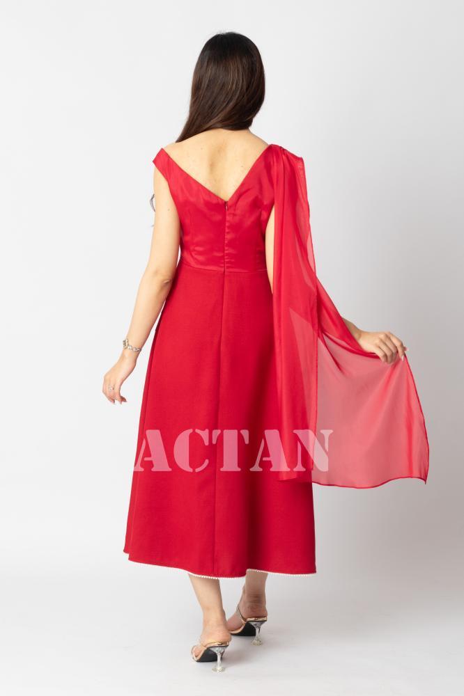نوع القصة: فستان ميدي كتان بكم كيب بطرف مزين بلؤلؤ