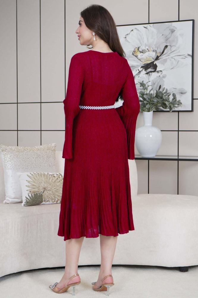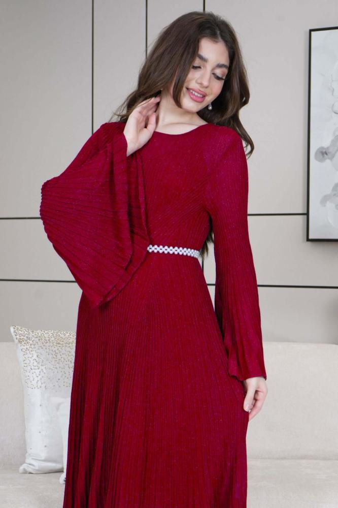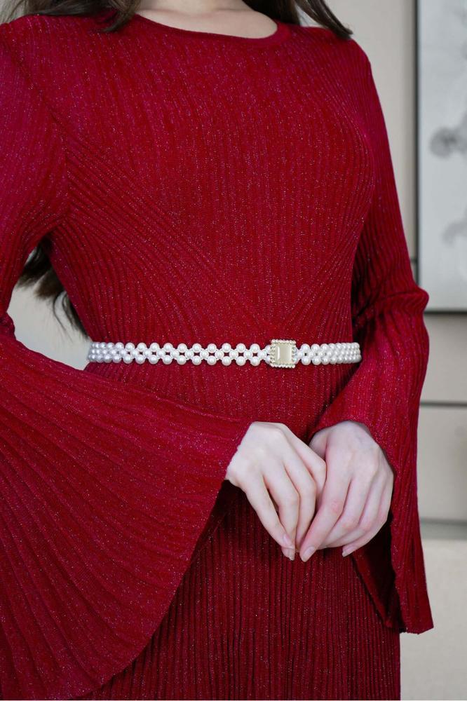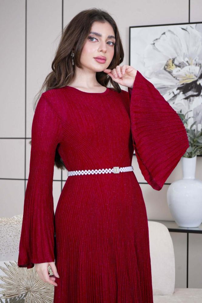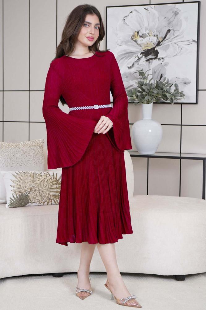 فستان ميدي بليسيه بحزام لؤلؤ لون عنابي