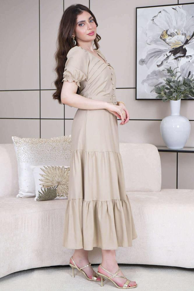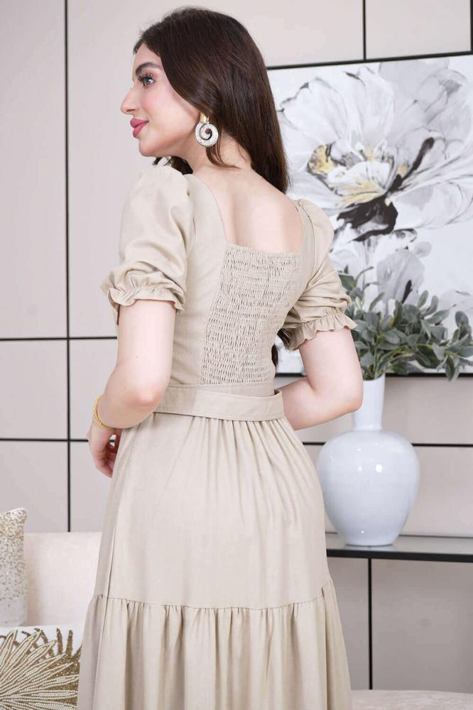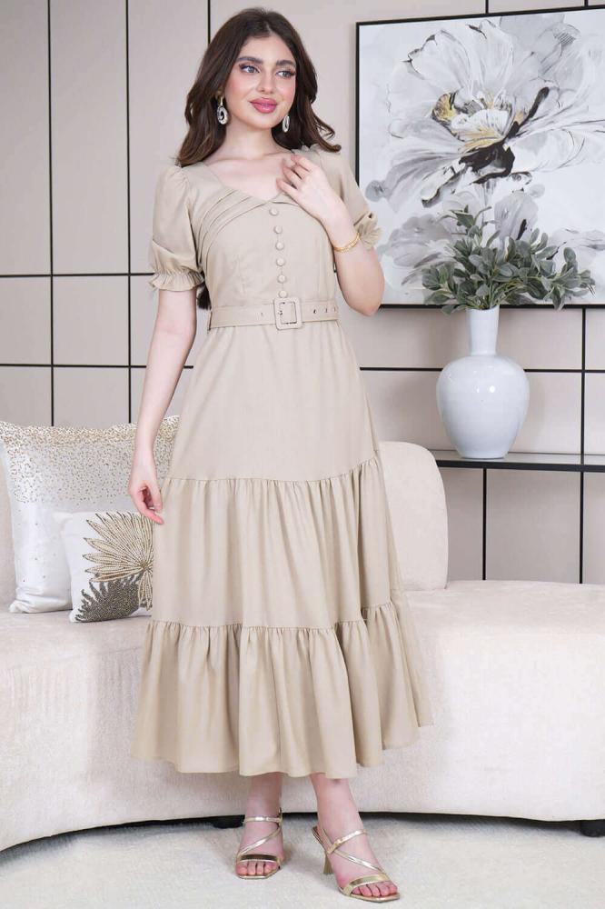 - نوع القصة: فستان ميدي بتصميم أزرار وحزام على الخصر، بأكمام قصيرة وياقة مربعة