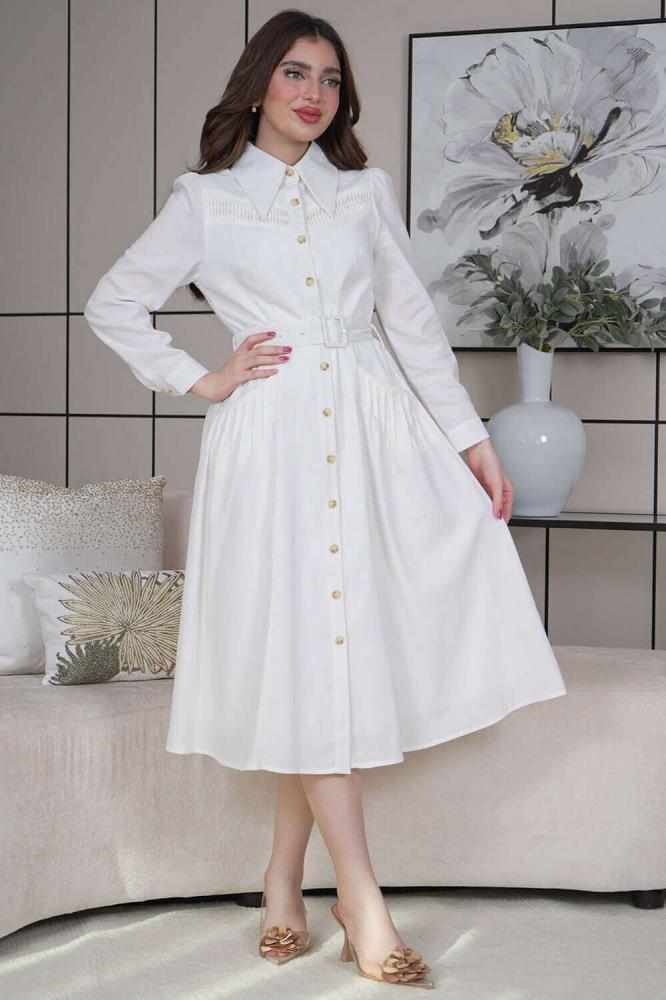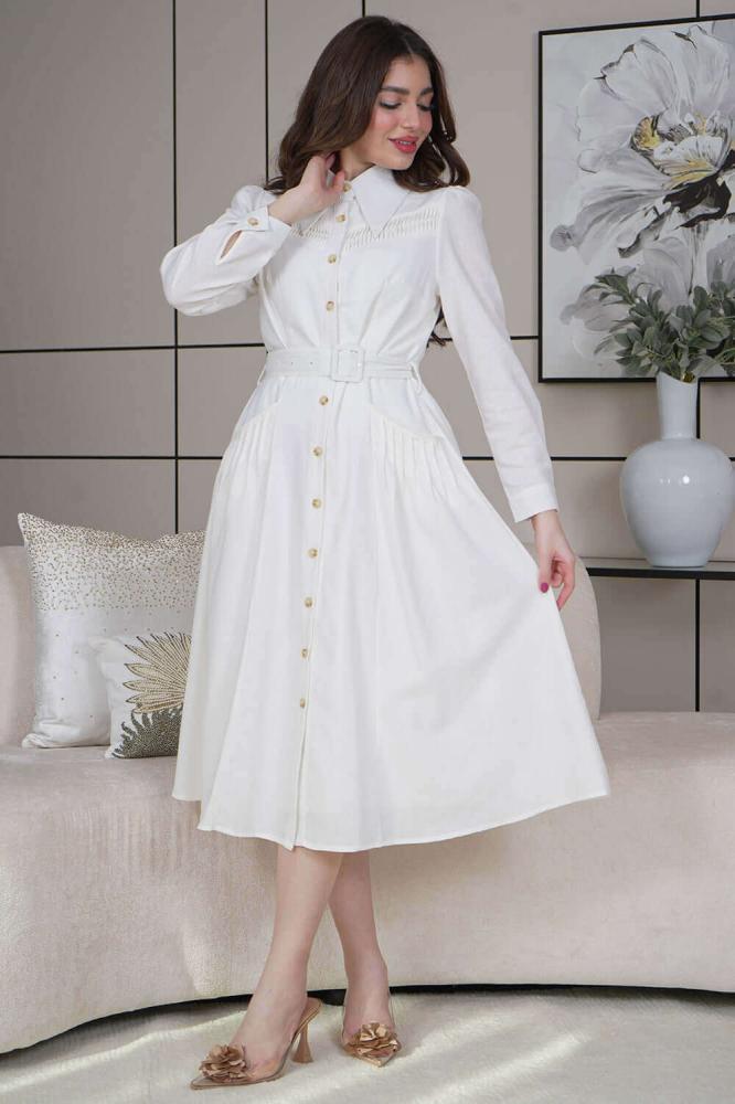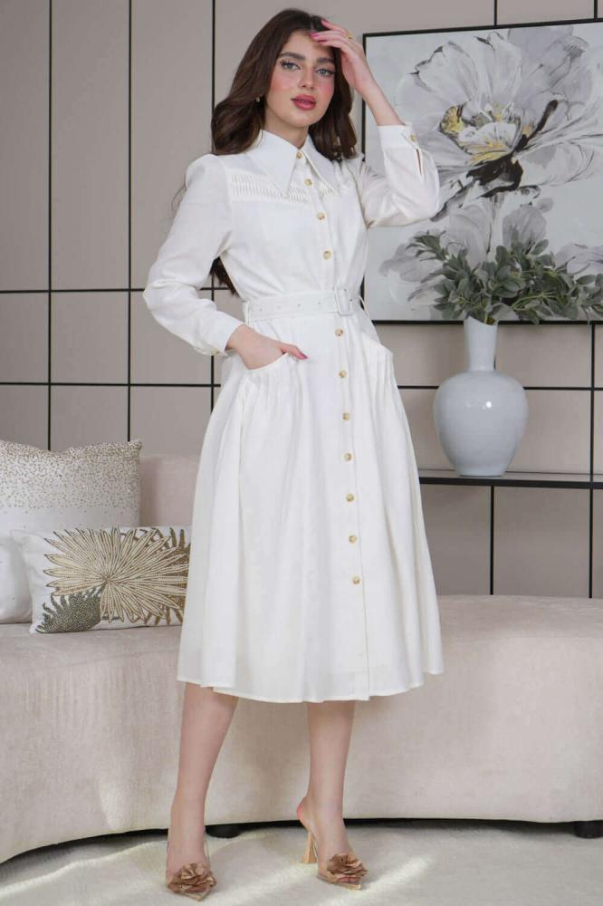 - نوع القصة: فستان ميدي كتان بجيوب وحزام على الخصر