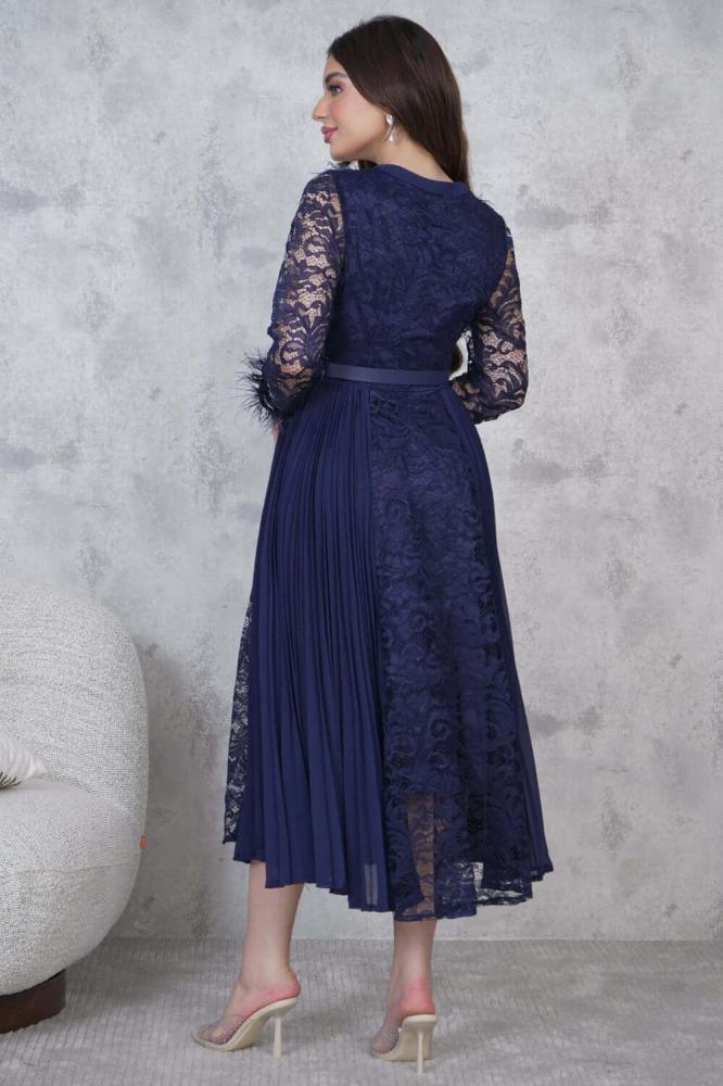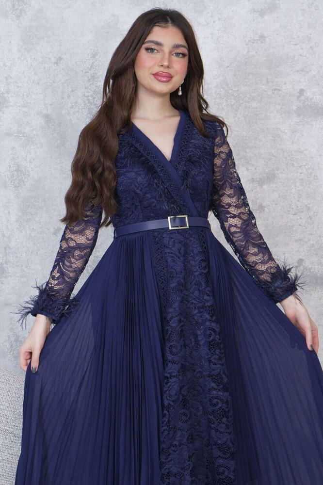 • نوع القصة: ميدي دانتيل شيفون بحزام على الخصر وأكمام طويلة بياقة V مزينة بالريش