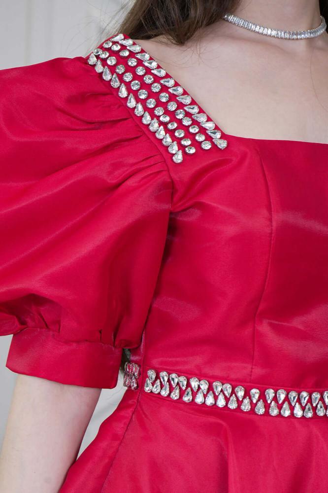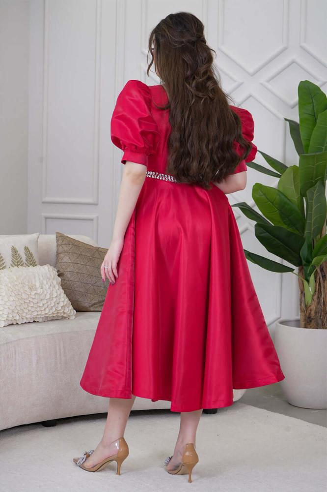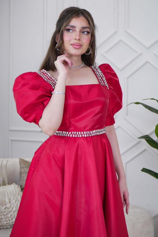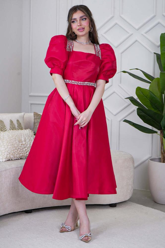 نوع التصميم: فستان ميدي مزين بكريستال بأكمام بف