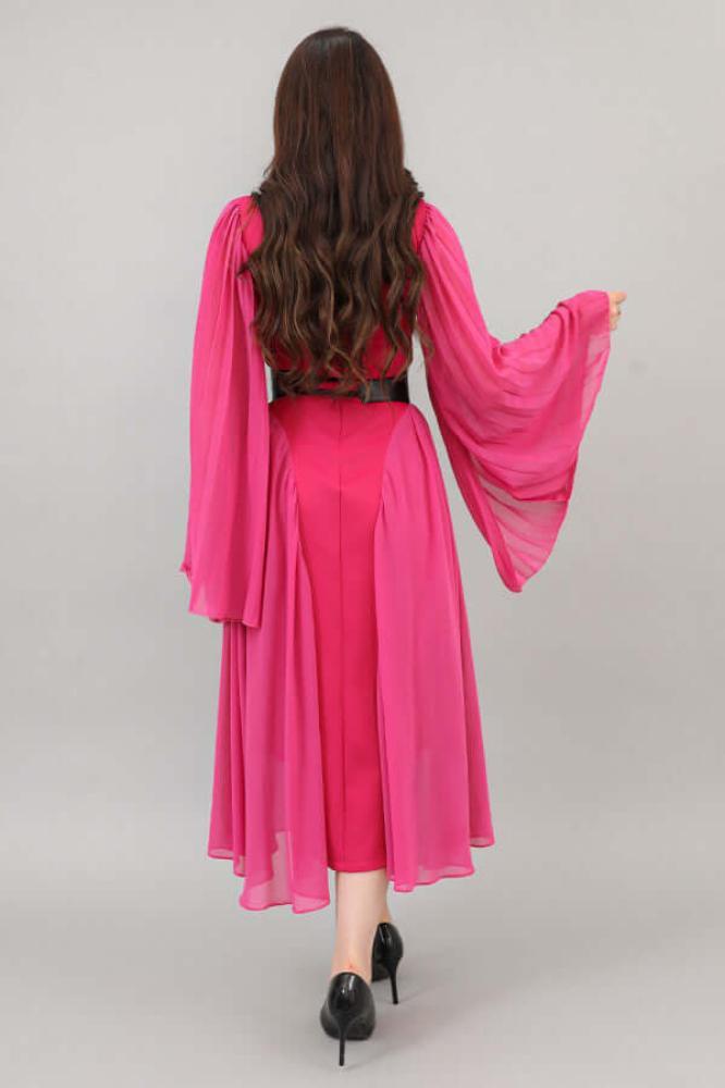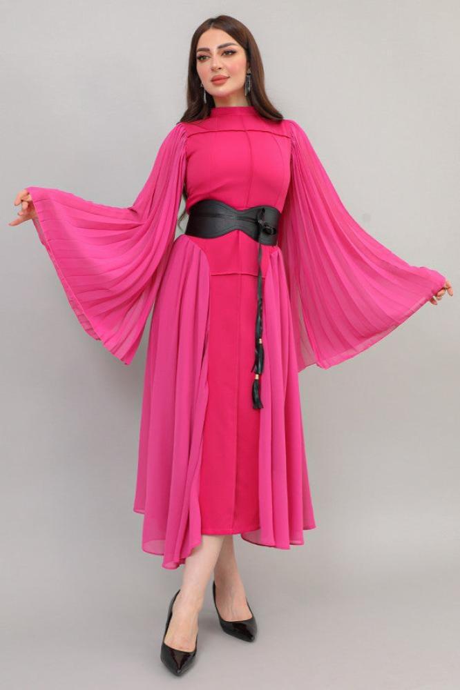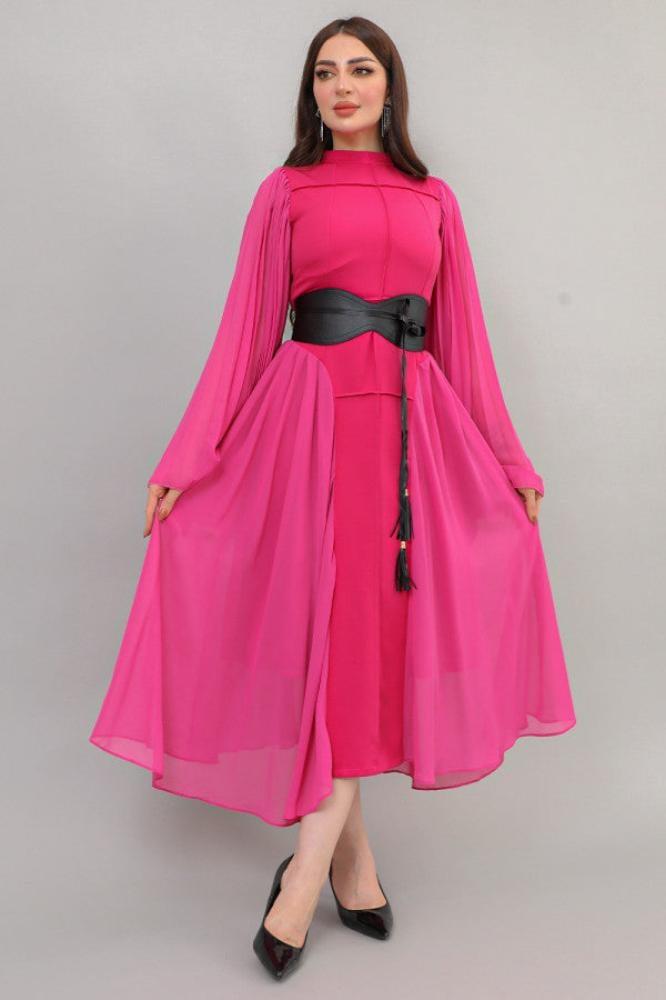 - نوع القصة: ميدي بكسرات جانبية، بياقة عالية، وكم طويل مع حزام على الخصر