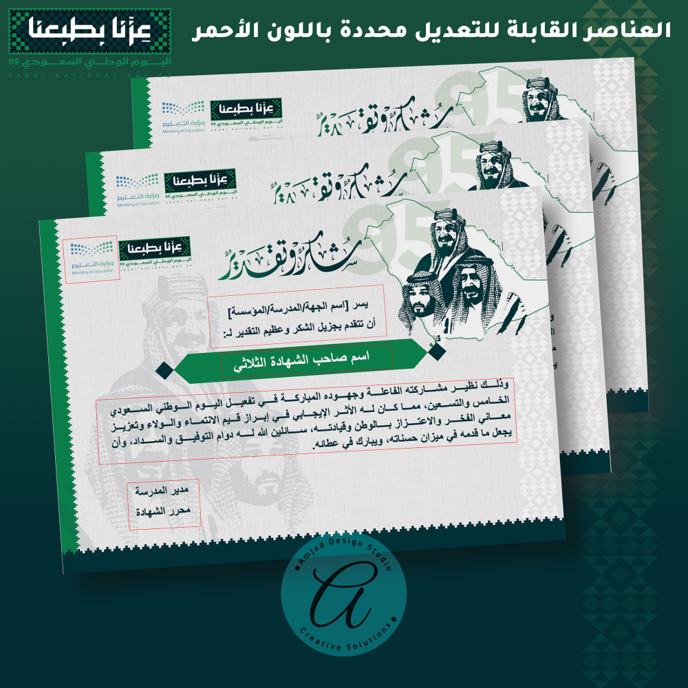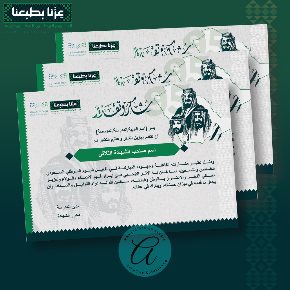 صُممت شهادة الشكر هذه بعناية لتكون لمسة ختامية مميزة لكل من ساهم في تفعيل المناسبة الوطنية داخل المدرسة أو المجتمع التعليمي أو الشركات والمناسبات الاجتماعية.