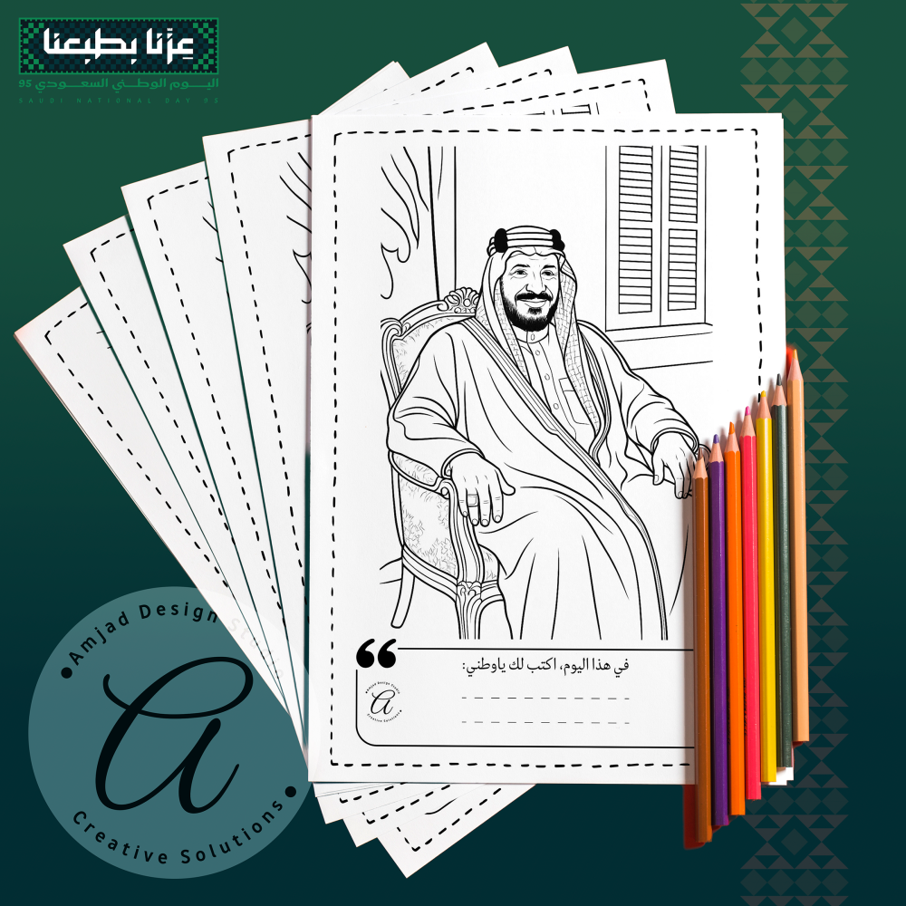 كتيب تلوين صُمم خصيصًا لمرحلة رياض الأطفال والمرحلة الابتدائية ليكون نشاطًا مميزًا ضمن فعاليات اليوم الوطني. يتيح للأطفال التعبير عن مشاعرهم الوطنية بطريقة فنية بسيطة، ويعزز لديهم الانتماء والاعتزاز بالهوية الوطنية من خلال رسوم تعبّر عن رموز الوطن.