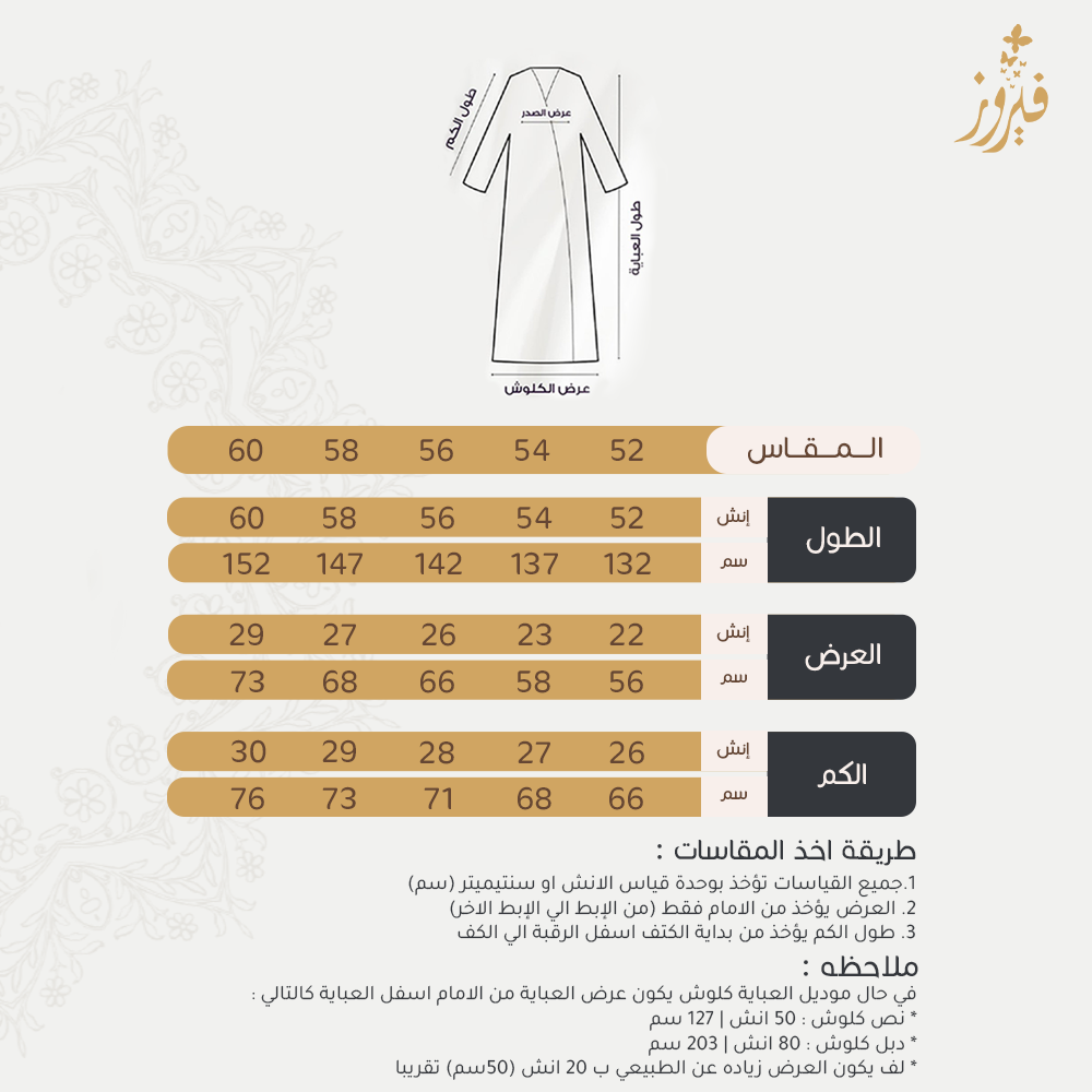 ملحوظات المقاسات :