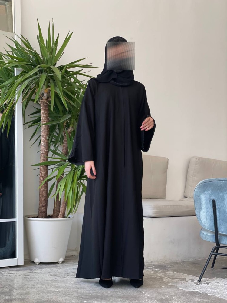 عباية خفيفة سادة نص كلوش من قماش البوليستر الكوري مع كم كلفة خرز بسيط مع طرحة سادة.
