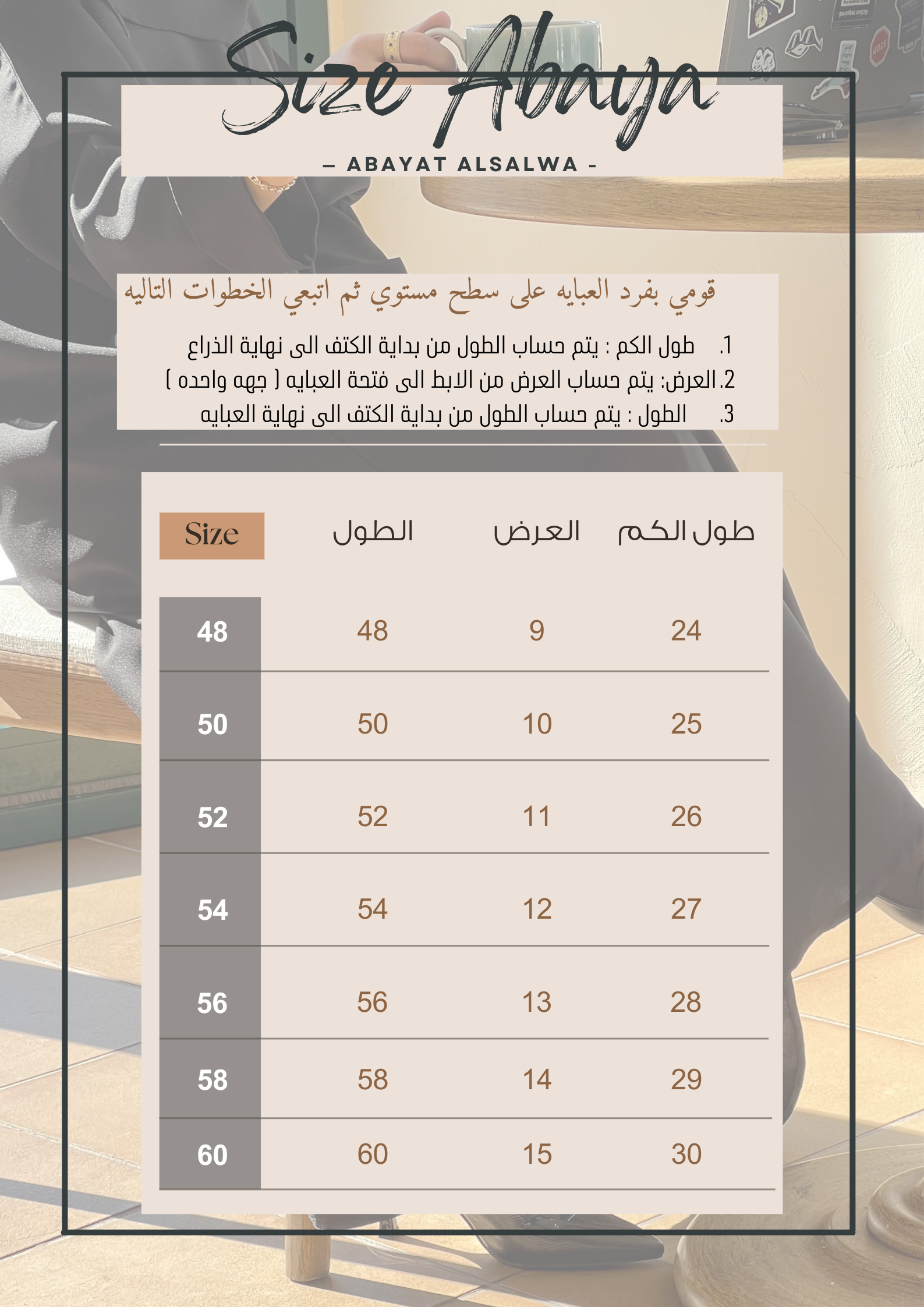 لضمان أفضل جودة وارضاء العميل وضعنا لكم نحن متجر السلوى دليل إرشادي لاختيارك المقاس المناسب لتتميزي بعبايتك على النحو التالي:-