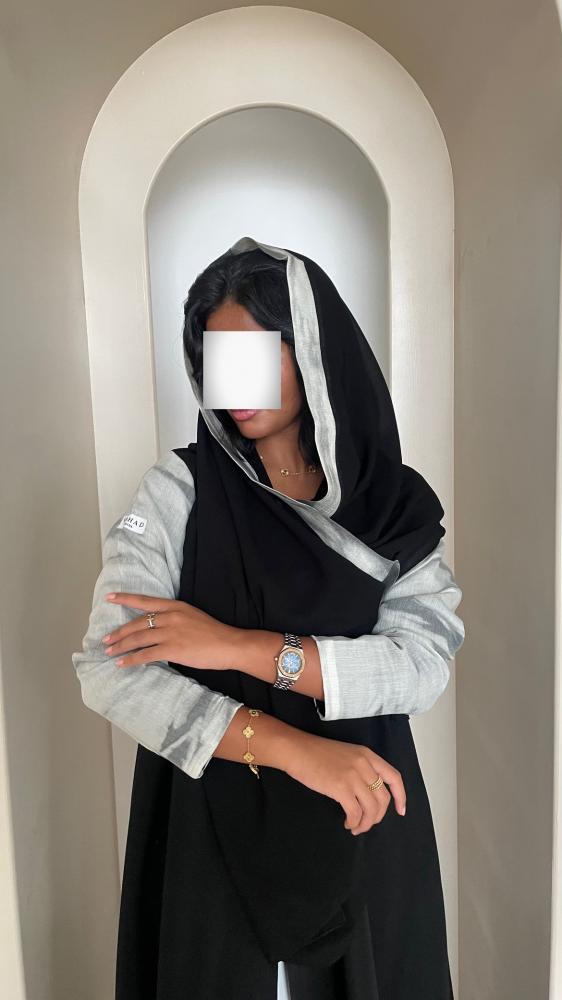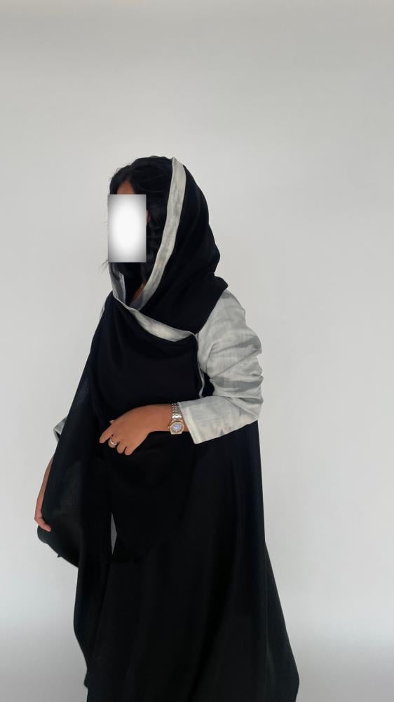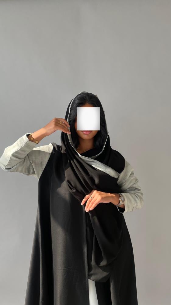 القماش : كريب كتان شمالي أسود ، الأكمام شيفون مبطن ، طرحة أسود بطرف