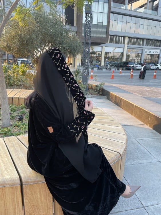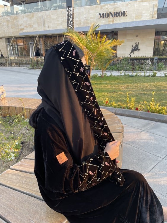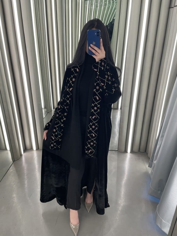 القماش: مخمل اسود، اكمام مخمل مطرزة