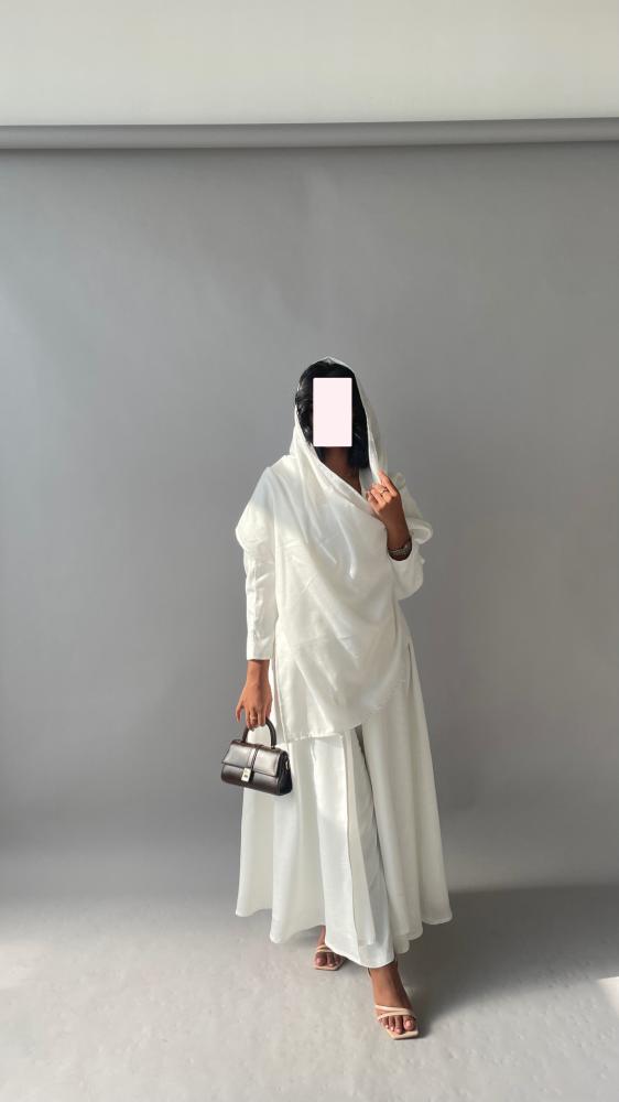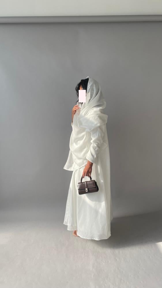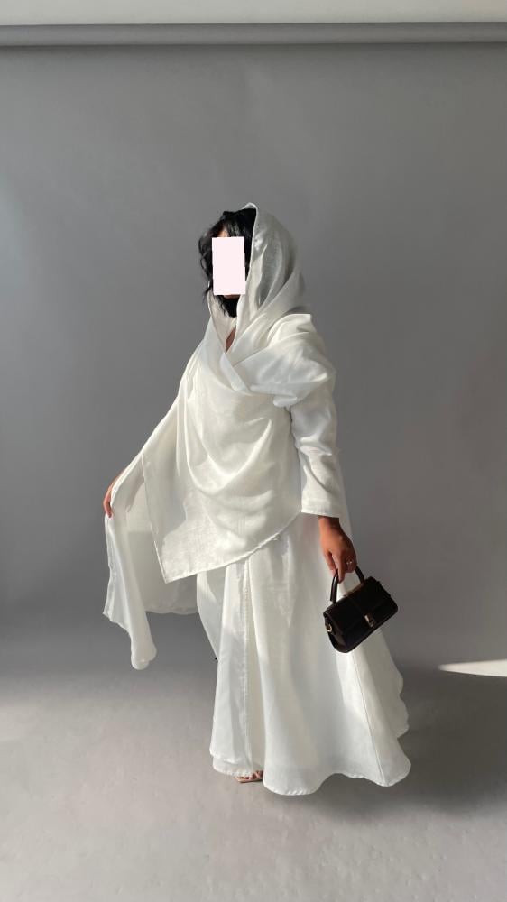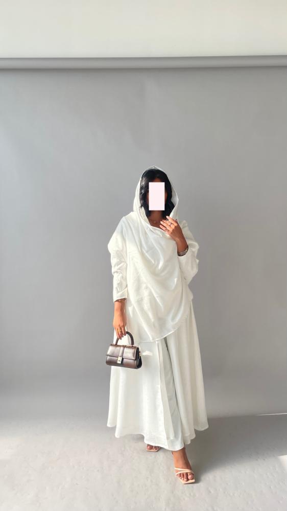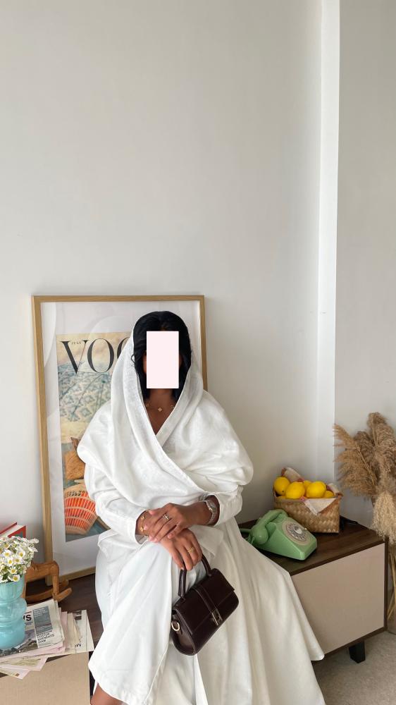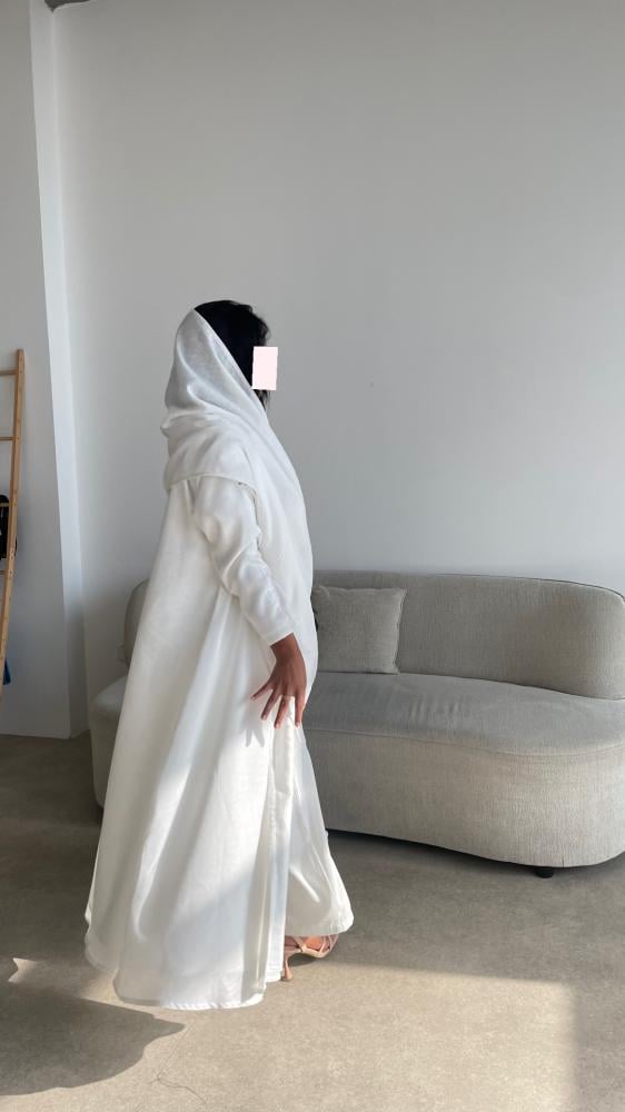 القماش : لينن ابيض مبطن ، طرحة من نفس قماش العباية