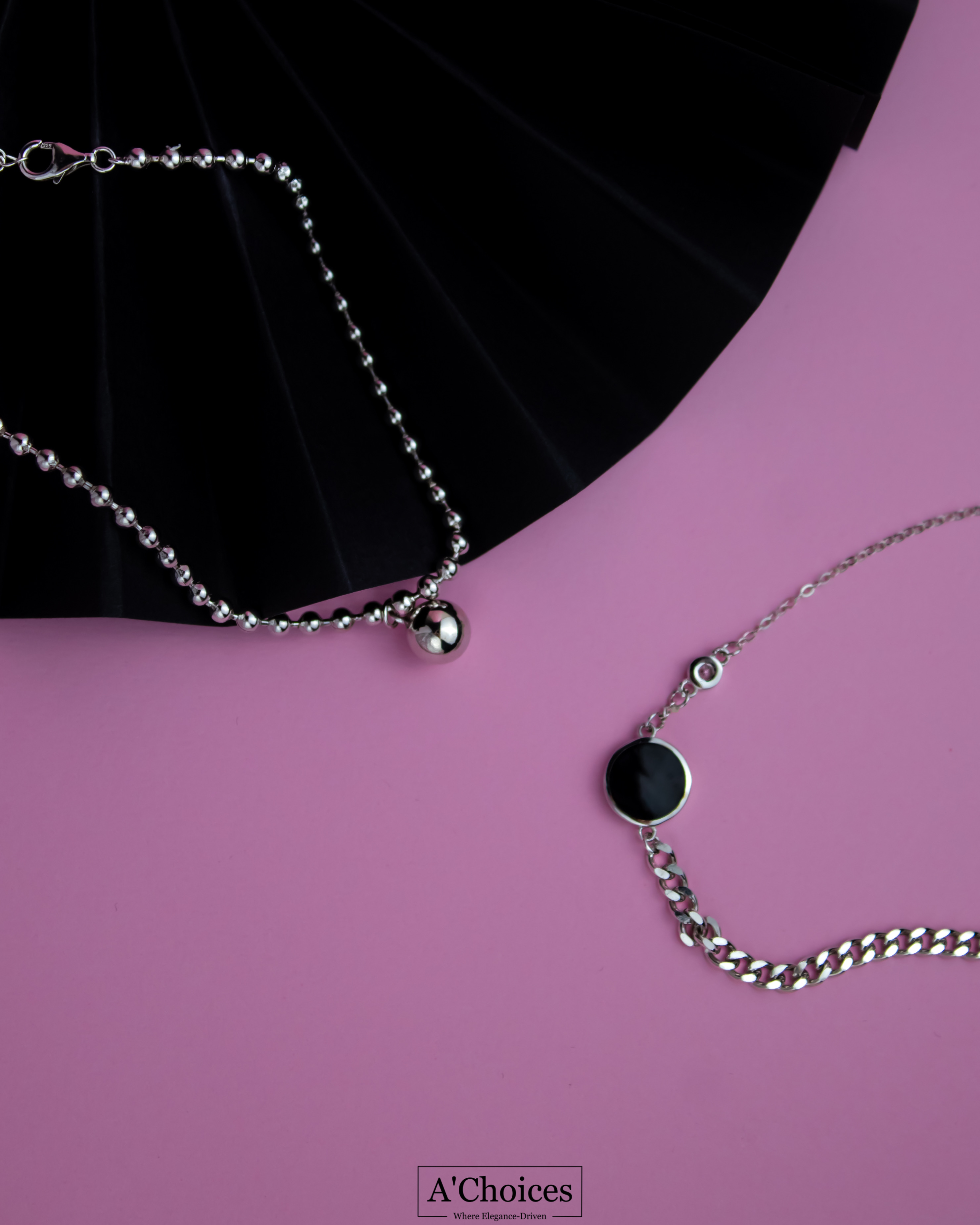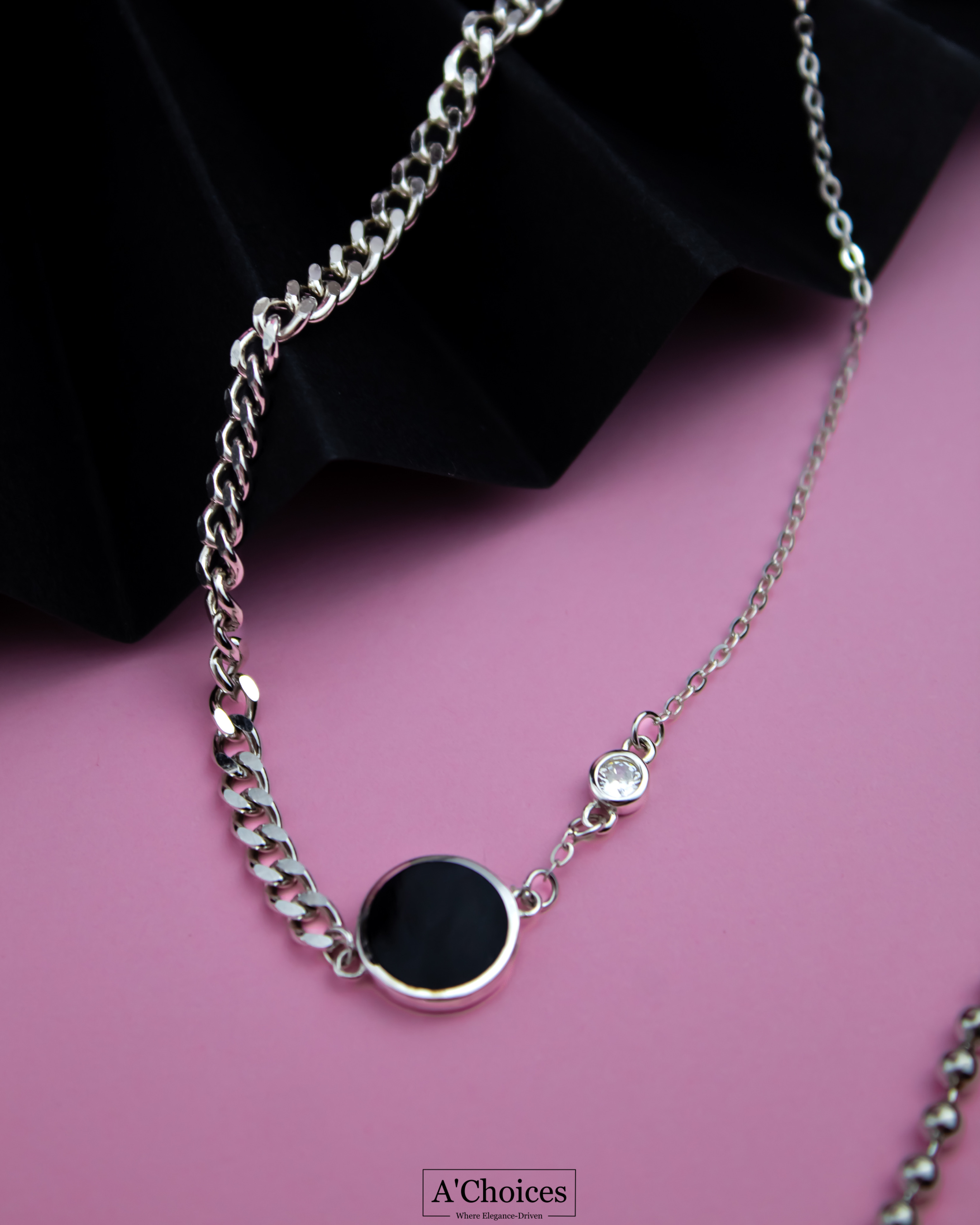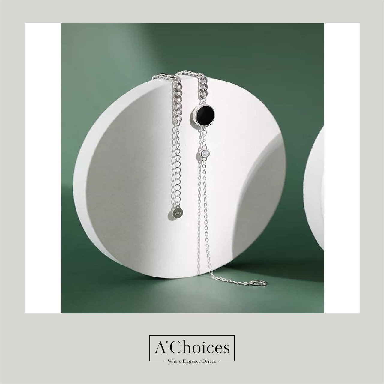 يتميز خلخال بتصميم كلاسيكي أنيق، حيث يتكون من سلسلة فضية رفيعة مع حجر أسود وزيركون مرصع في منتصفها، مما يضفي عليه مظهرًا جذابًا وأنيقًا.