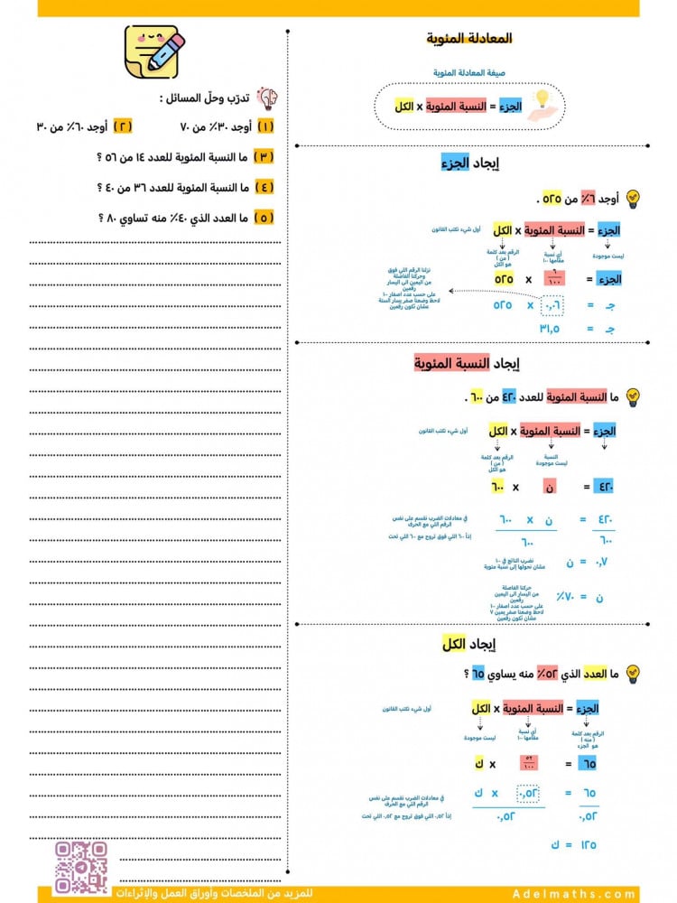 هذا ملخص PDF يشرحلك دروس الباب الأول ( النسبة المئوية ) خطوة خطوة وبدون دش كلام .
