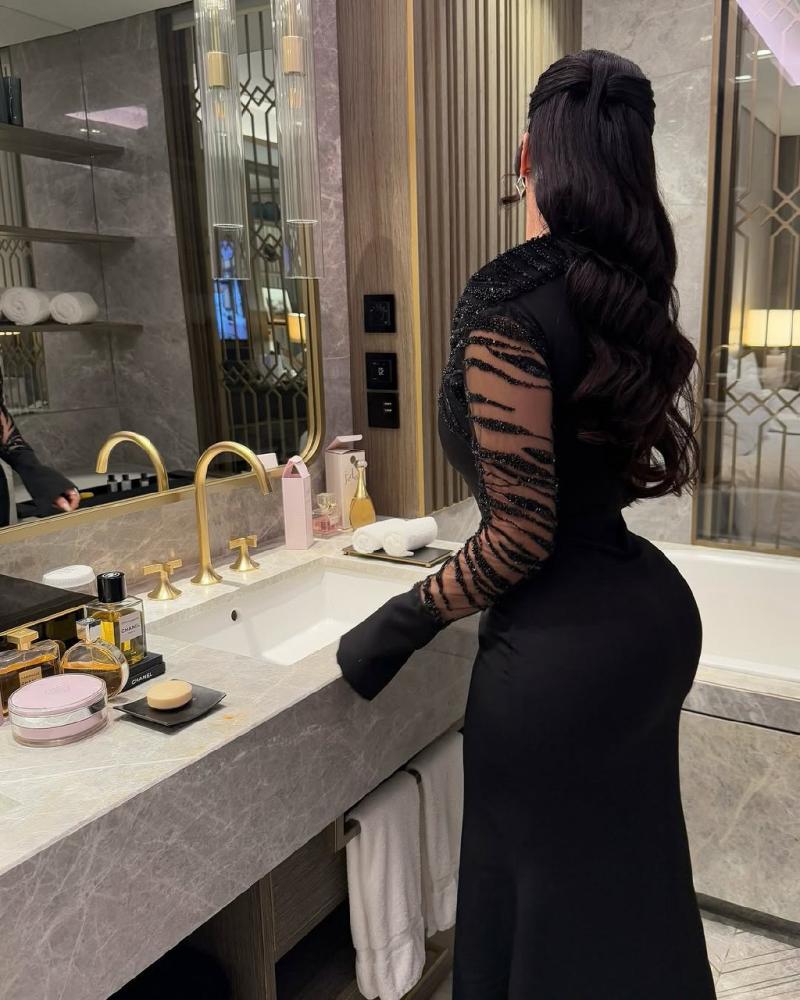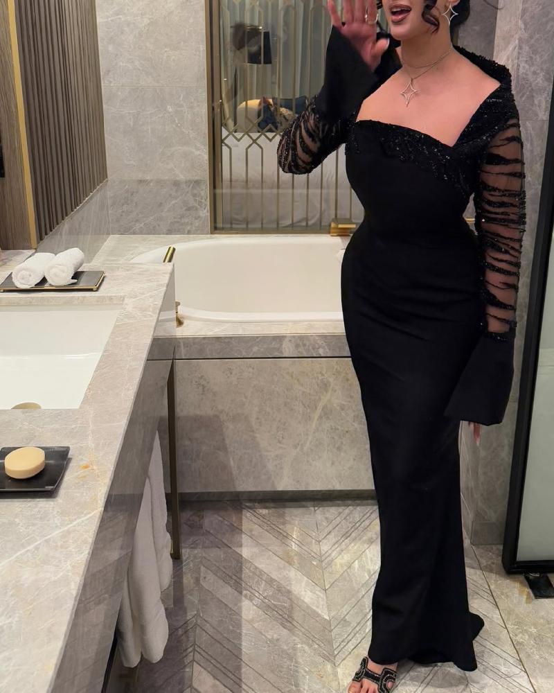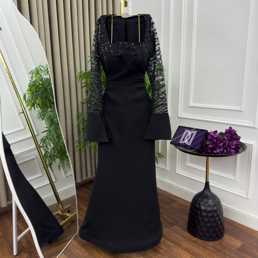 فستان أسود راقٍ بتصميم ضيّق يبرز القوام، مع فتحة صدر مستقيمة وأكمام طويلة شفافة مطرزة بخطوط لامعة تضيف لمسة فخمة.