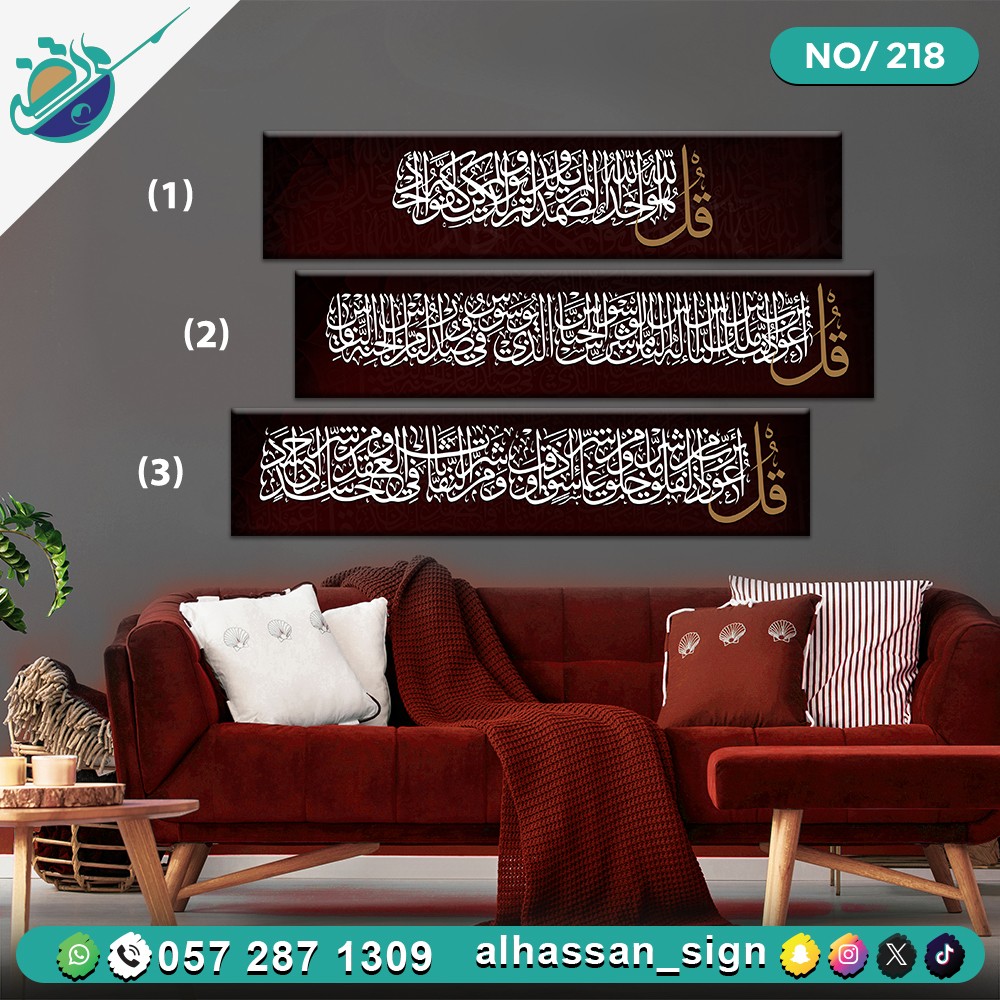 مخطوطة لسورة الإخلاص و الناس و الفلق على يد أمهر الخطاطين بتصميم فاخر مطبوعة على أجود أنواع قماش الكانفس و مشدودة على إطار من الخشب .