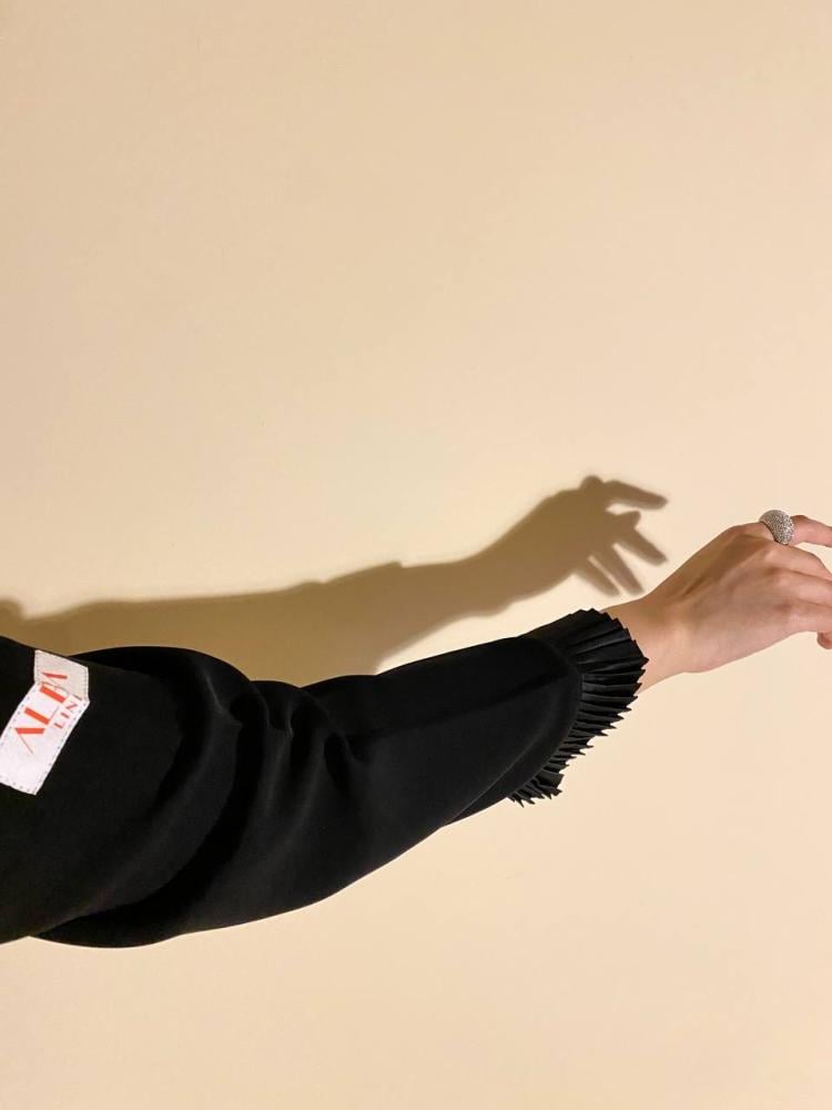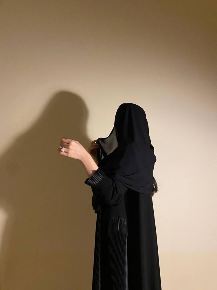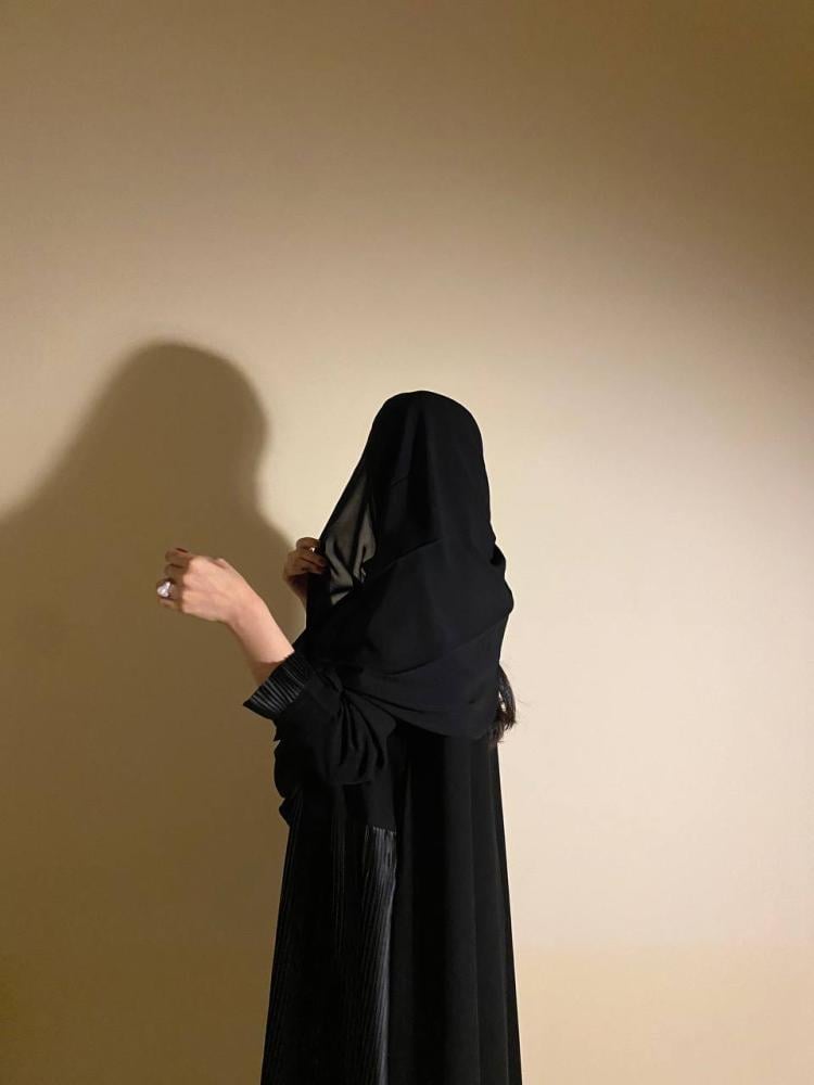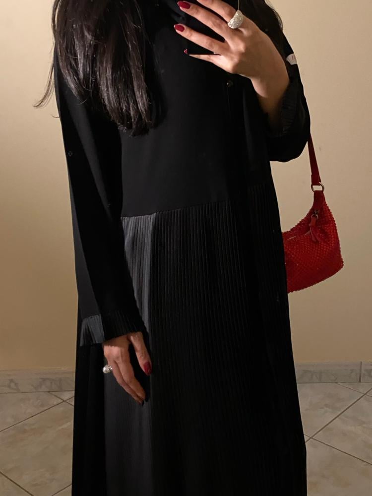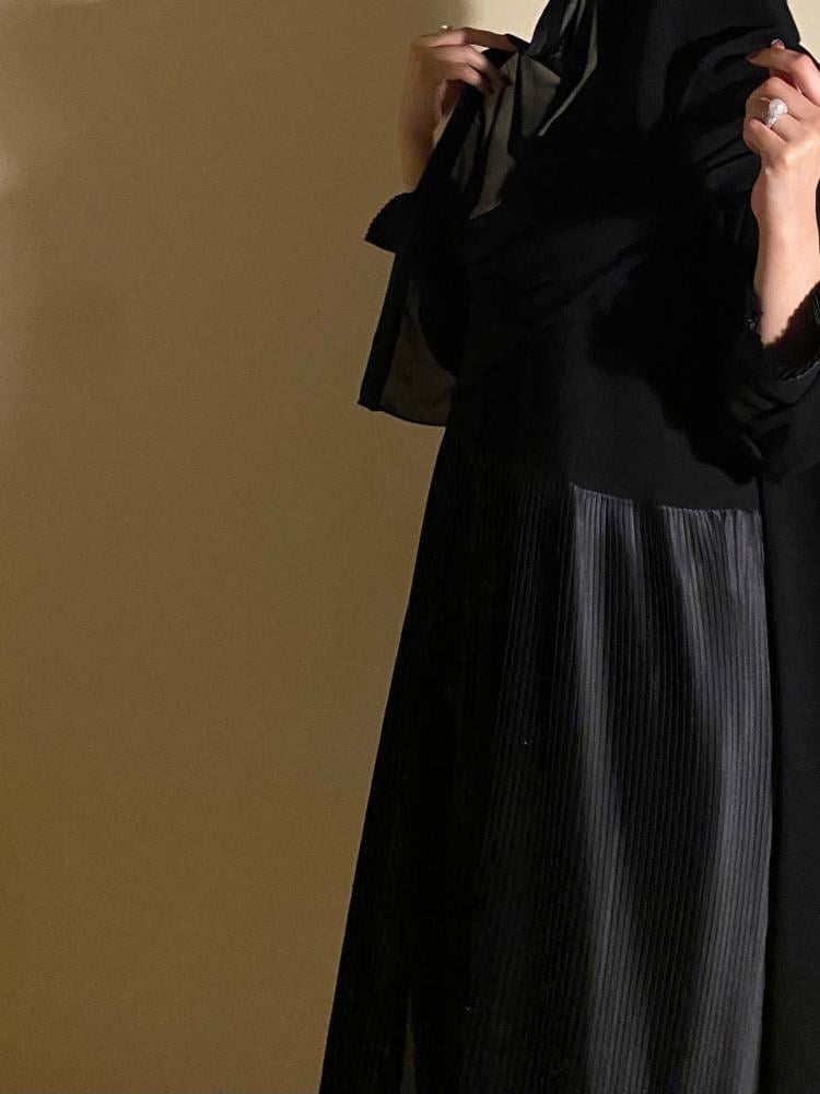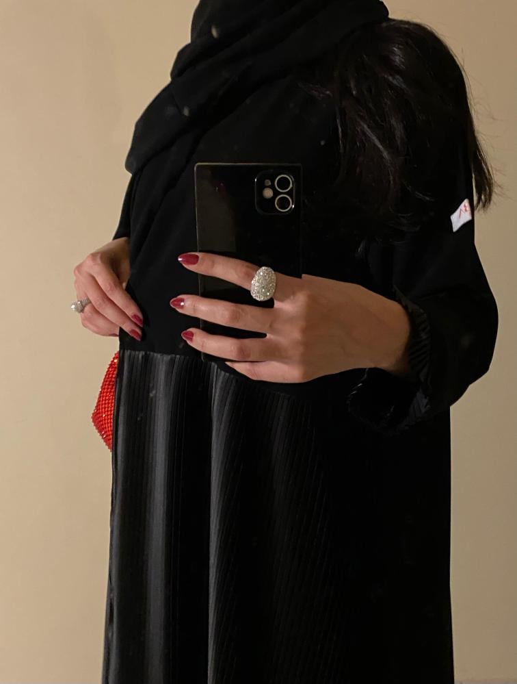 الوصف : عباية بقماش كريب أسود مع تدخيلات بقماش الحرير المكسر بالكم ومن الاسفل - مع امكانية اضافة طقطق .