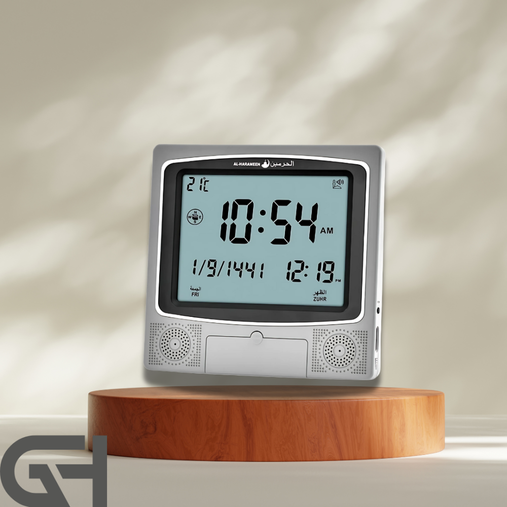 ساعة الحرمين الحائطية والمكتبية هي الخيار الأمثل لتنظيم وقتك بدقة وأناقة. بتصميم أكبر وشاشة واضحة، توفر لك مواقيت الصلاة بشكل تلقائي، إلى جانب عرض التاريخ الهجري والميلادي، وخاصية الأذان الكامل عند كل صلاة. كما تأتي بمنبه مستقل قابل للتخصيص لأي وقت ترغب فيه، بالإضافة إلى ميزة عرض درجة الحرارة، سواءً على الحائط أو على مكتبك بفضل قاعدتها العملية، تجمع هذه الساعة بين الوظائف المتكاملة والتصميم الفاخر لتلائم احتياجاتك الدينية واليومية.