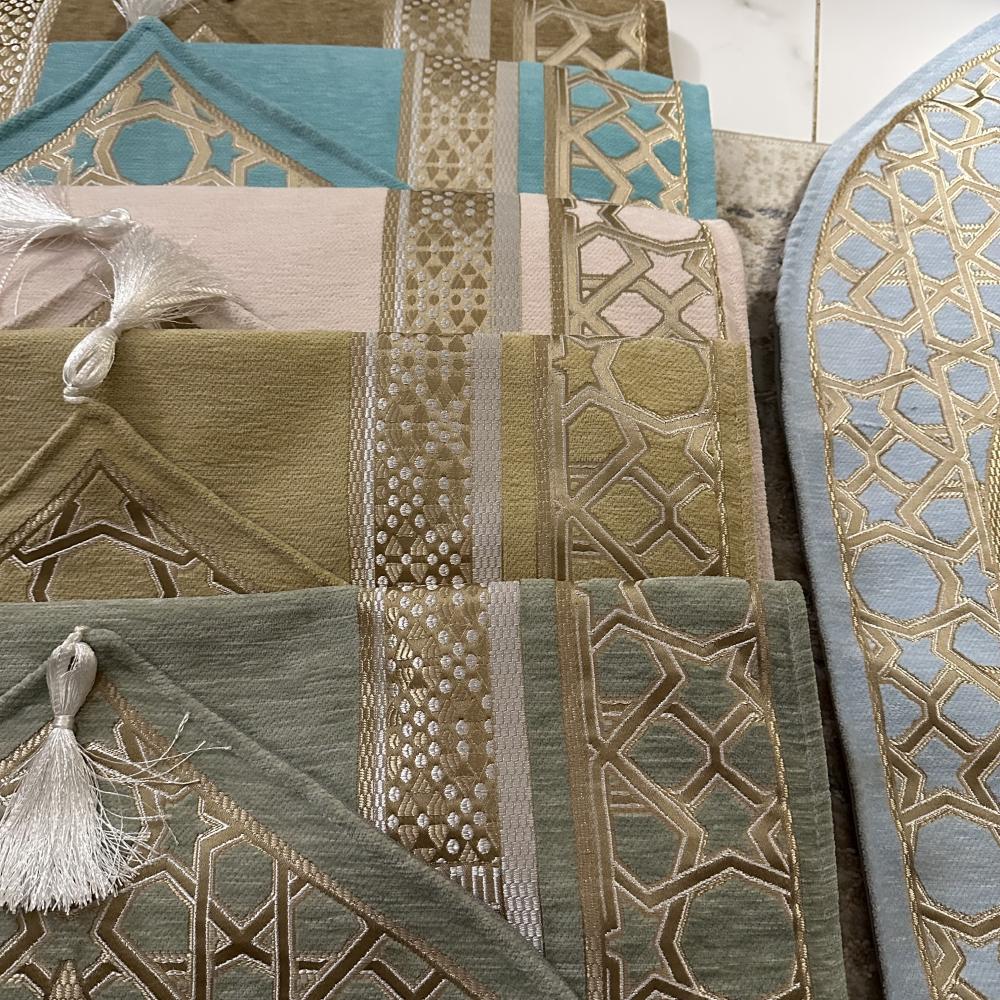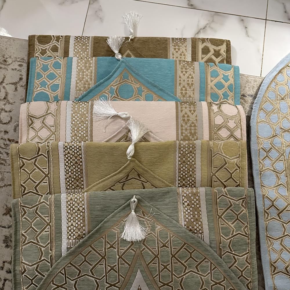 مطرزة بزخرفة إسلامية، مصنوعة من قماش الشانيل مع حشوة بسُمك 1 سم لراحة الركبة والكوع أثناء السجود. المقاس: 113 سم × 70 سم