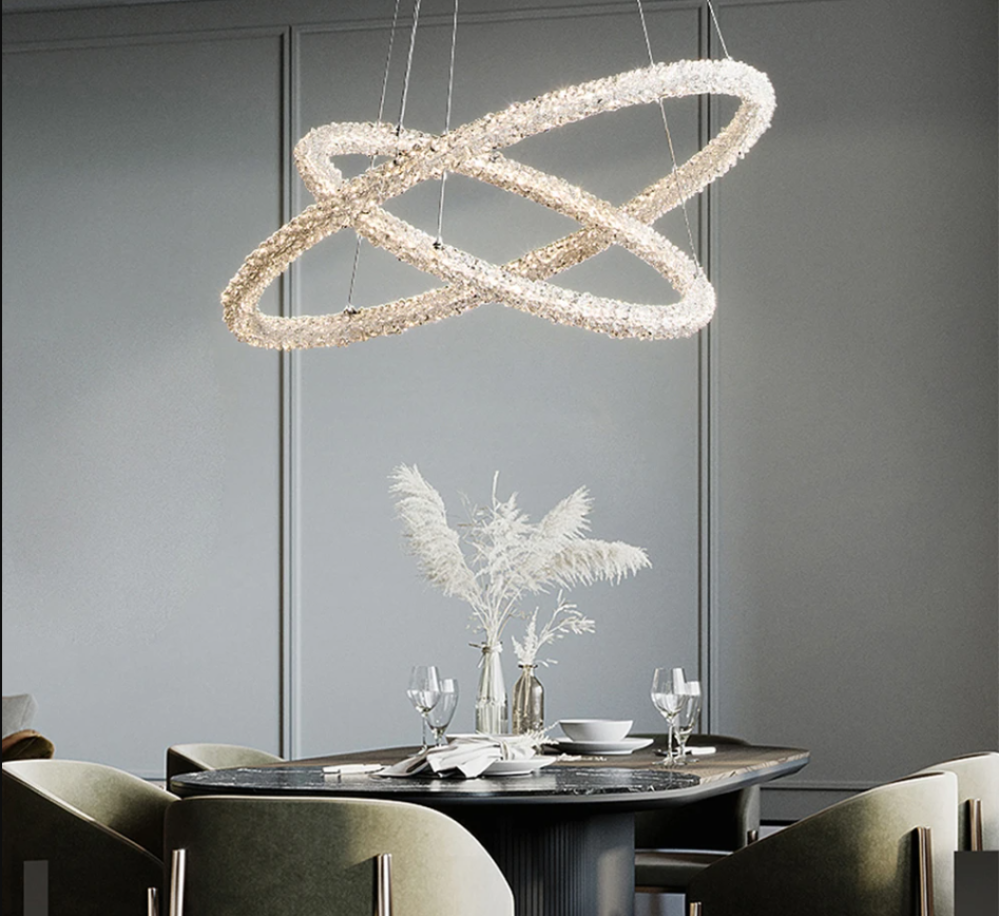 - ثريا حلقتين المواد: كريستال 9 كية والستانلس ستيل أبيض كول (4500 كلفن- 6000 كلفن)/ غير قابل للتعتيم. إنه ساطع جدًا .