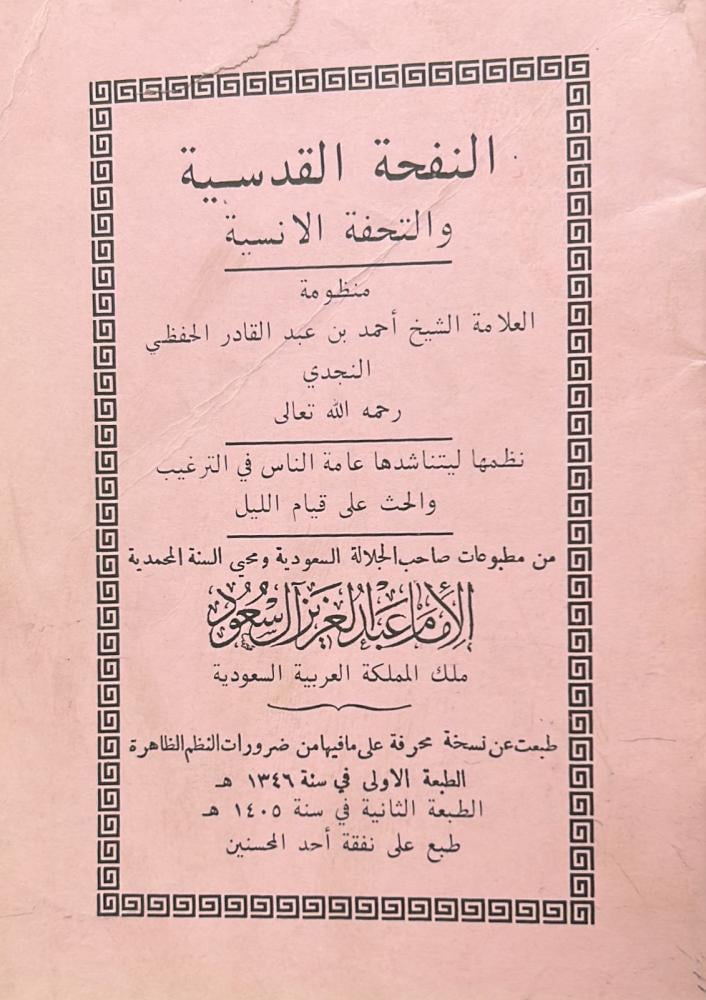 النفحة القدسية والتحفة الانسيةمنظومة احمد بن عبدالقادر الحفظيط2: 1405هـ31 صفحة - نسخة مخزنة - قطع صغير