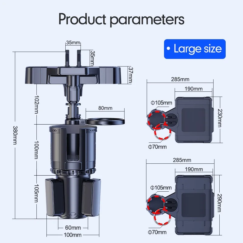 **Adjustable and Stable Cup Holder: Equipped with a rotating expandable base, the cup holder adapts to various car models, fitting cup holders between 60mm and 100mm, ensuring a secure and stable setup.