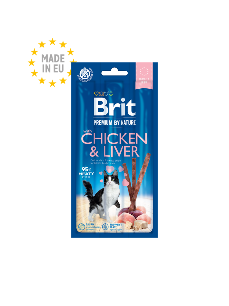 سناك Brit Premium Stick Treats للقطط بطعم الدجاج والكبد، مكافأة لذيذة وعالية الجودة مصممة لإرضاء ذوق القطط ودعم صحتها في نفس الوقت. يتميز بقوام طري وسهل التقطيع، مما يجعله مثالياً للتدريب أو كمكافأة بين الوجبات.