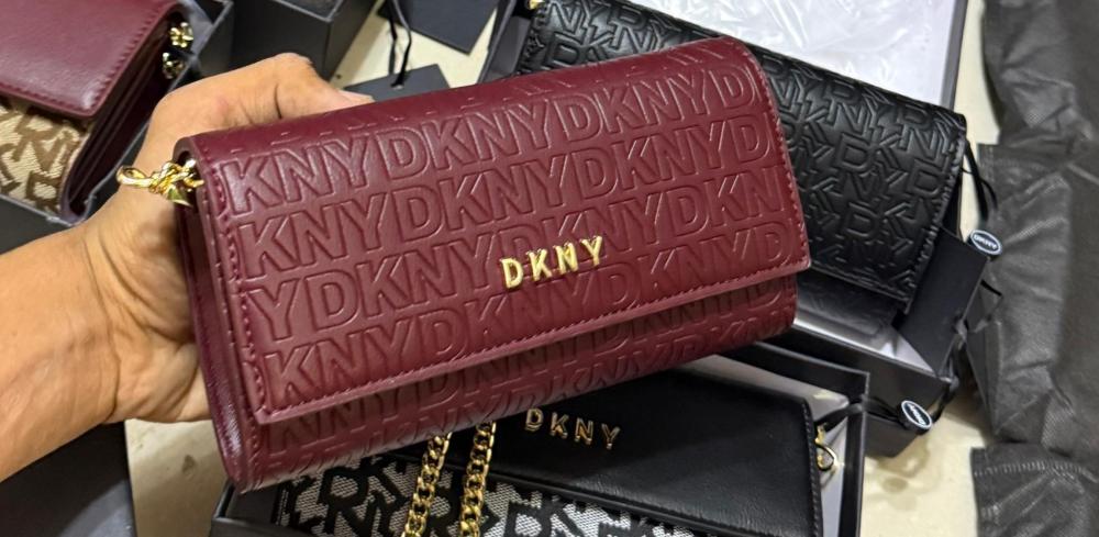 محفظة DKNY السوداء الفاخرة بنقشة الشعار وسلسلة ذهبية