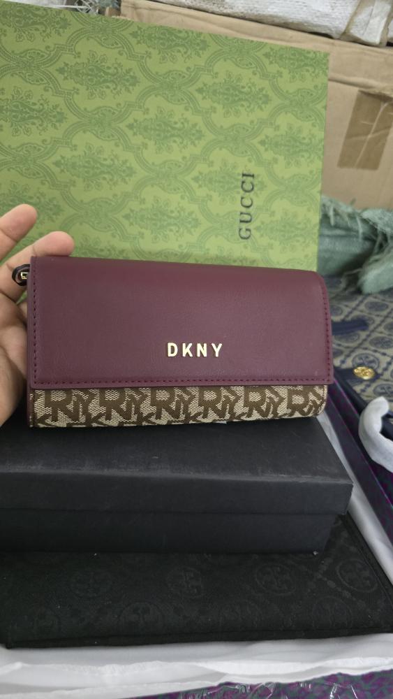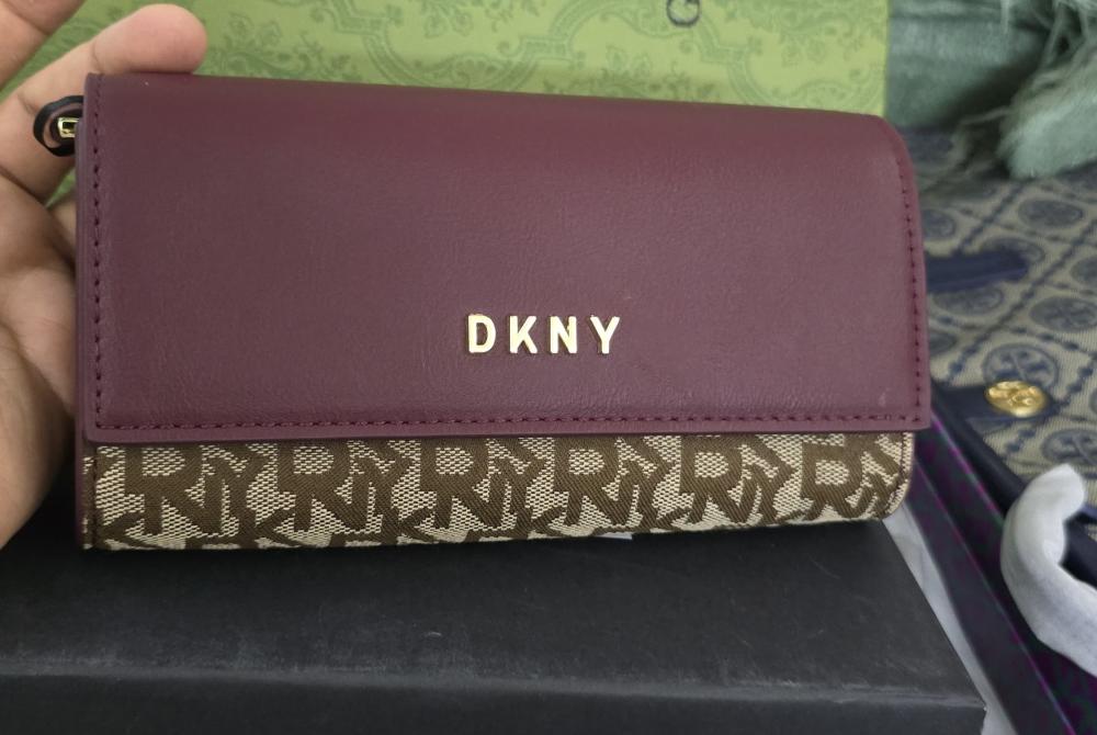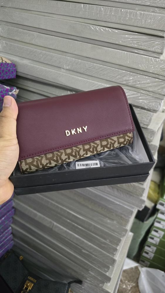 الواجهة العلوية للمحفظة لونها بني فاتح سادة، بينما الجزء السفلي يحتوي على نقشة متكررة لشعار DKNY بلون بني أغمق.