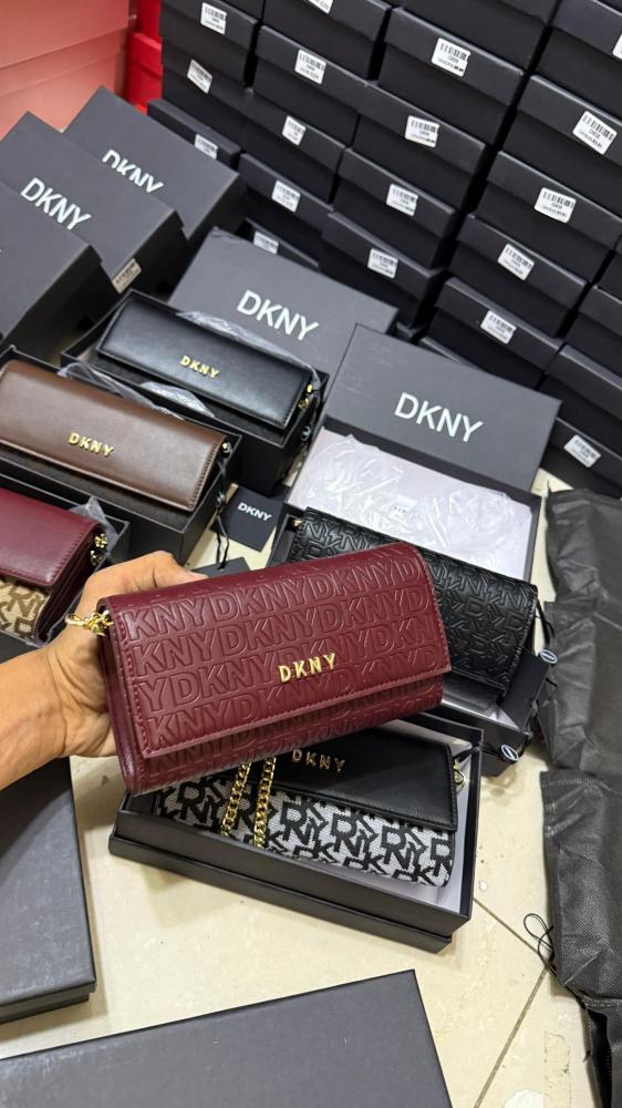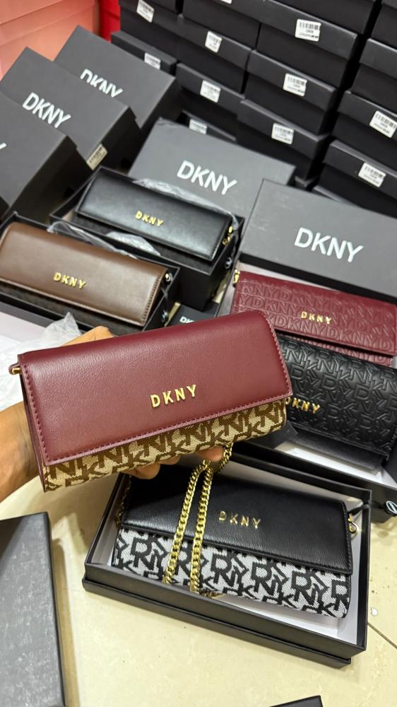 محفظة DKNY أنيقة وعصرية باللون الأسود، تتميز بنقشة بارزة لشعار الماركة وشعار ذهبي لامع. مرفقة بسلسلة ذهبية رفيعة لاستخدامها كحقيبة كتف أو كروس بودي. مثالية لإضافة لمسة فخامة وعملية لإطلالتك اليومية أو المسائية.