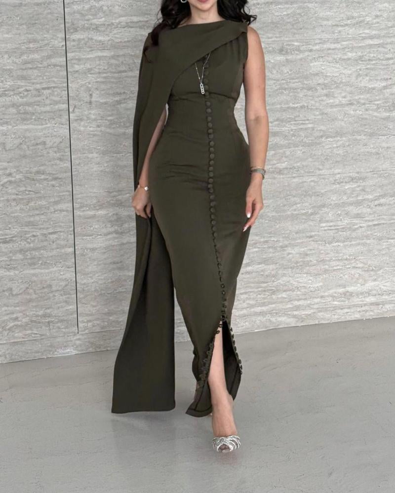 الفستان أنيق بلون زيتي داكن، يتميز بقصة ضيّقة تبرز القوام، مع أزرار مكسوّة بنفس اللون تمتد بشكل طولي على طول الأمام. تصميم الكتف الأيمن يأتي بكمّ طويل وواسع يشبه الكاب، بينما الكتف الأيسر مكشوف، ما يضيف لمسة فخمة وغير تقليدية. الفستان بدون نقوش ويعتمد على البساطة والرقي في التصميم، ومثالي للإطلالات الرسمية أو السهرات الراقية.