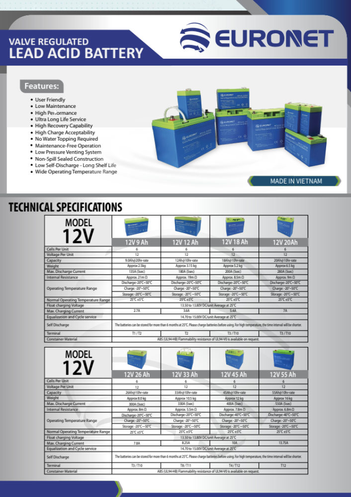 احصل على الكفاءة التي تستحقها مع بطارية EURONET موديل NP12-26، المصممة خصيصاً لتكون الحل الأمثل لأنظمة الطاقة الشمسية والاحتياطية. بفضل تقنية الرصاص الحمضي المحكم (Valve Regulated)، تمنحك هذه البطارية عمراً افتراضياً طويلاً وأماناً عالياً دون الحاجة لأي صيانة.