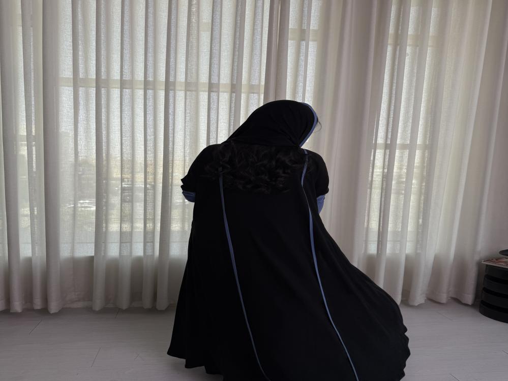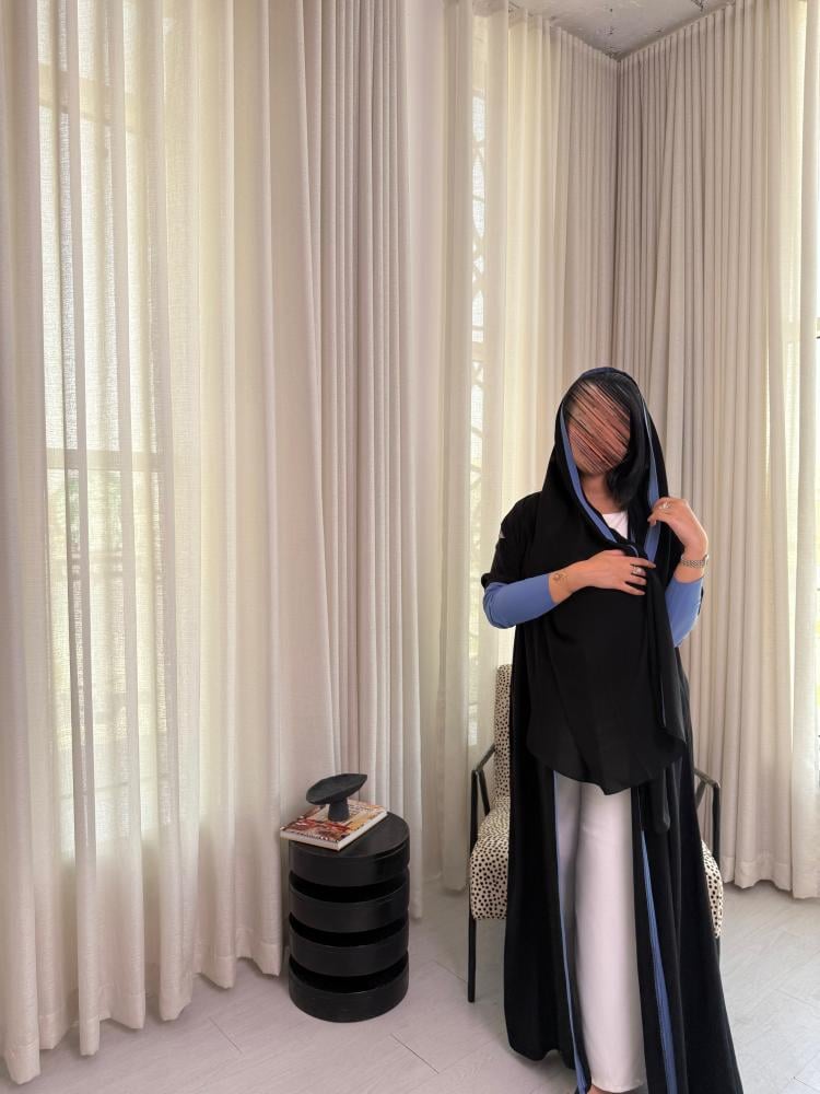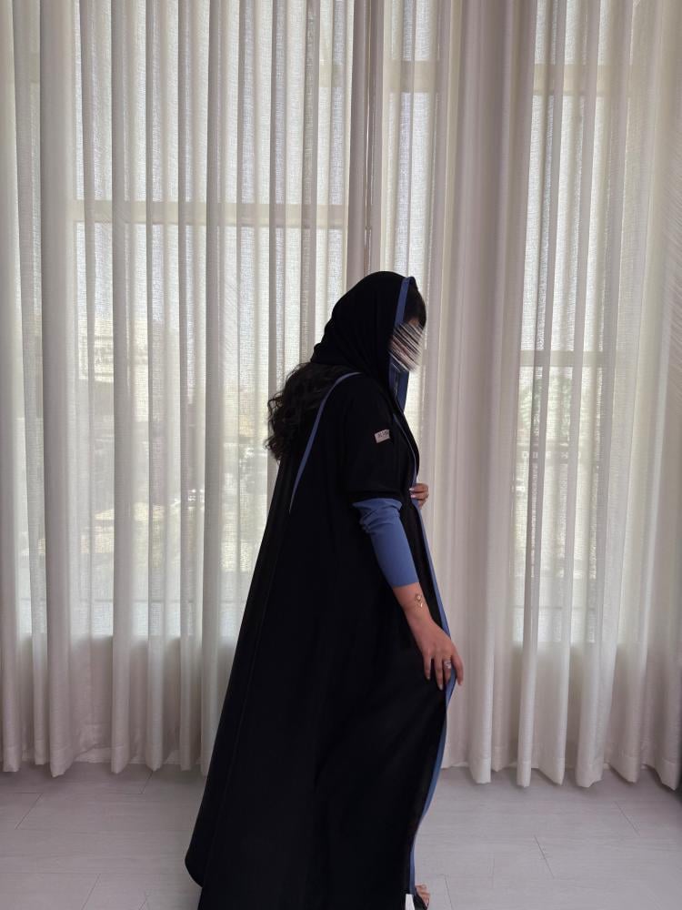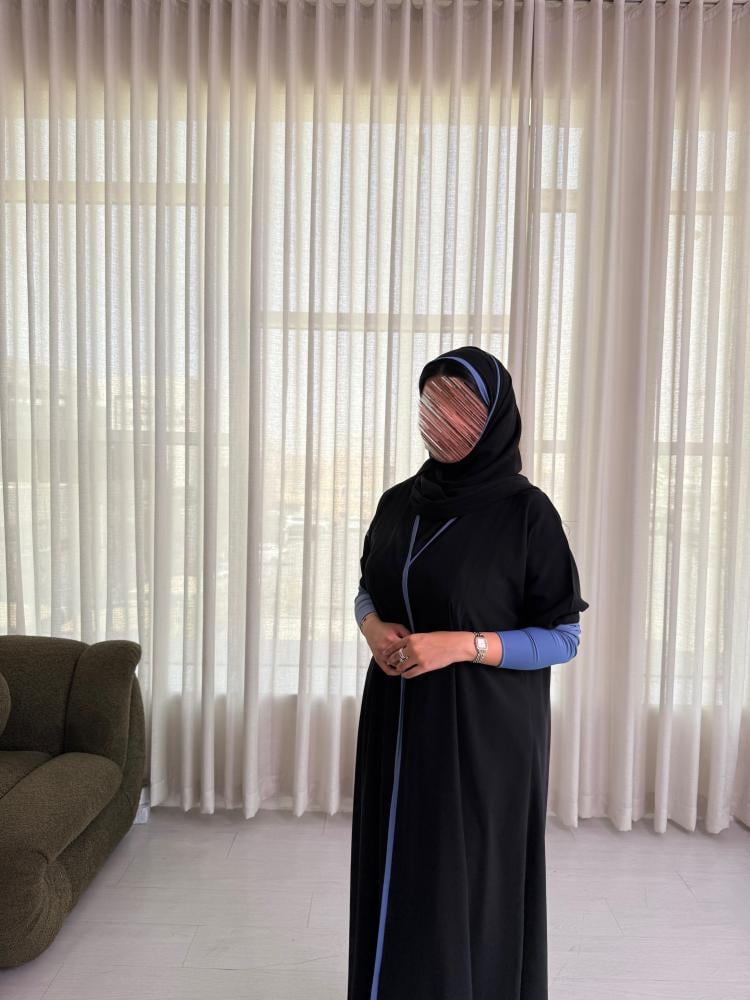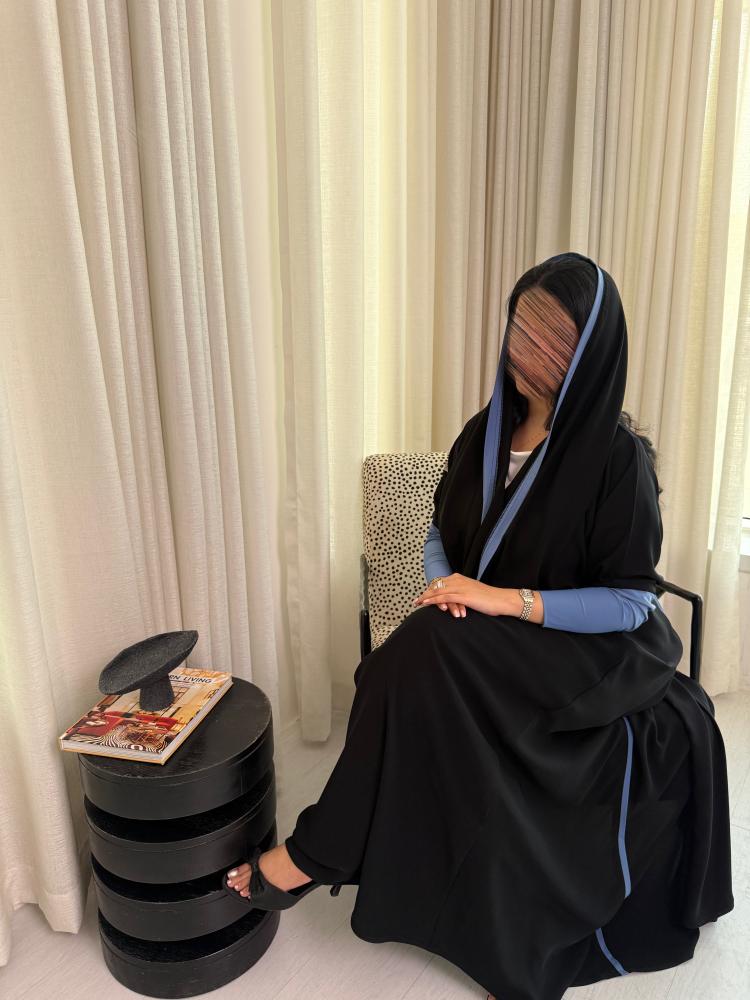 قصة العباية ( كلوش)، الخام المستخدم كريب كوري أسود مع إضافة سترتش ازرق بالأكمام وتحديد من الأمام والخلف.