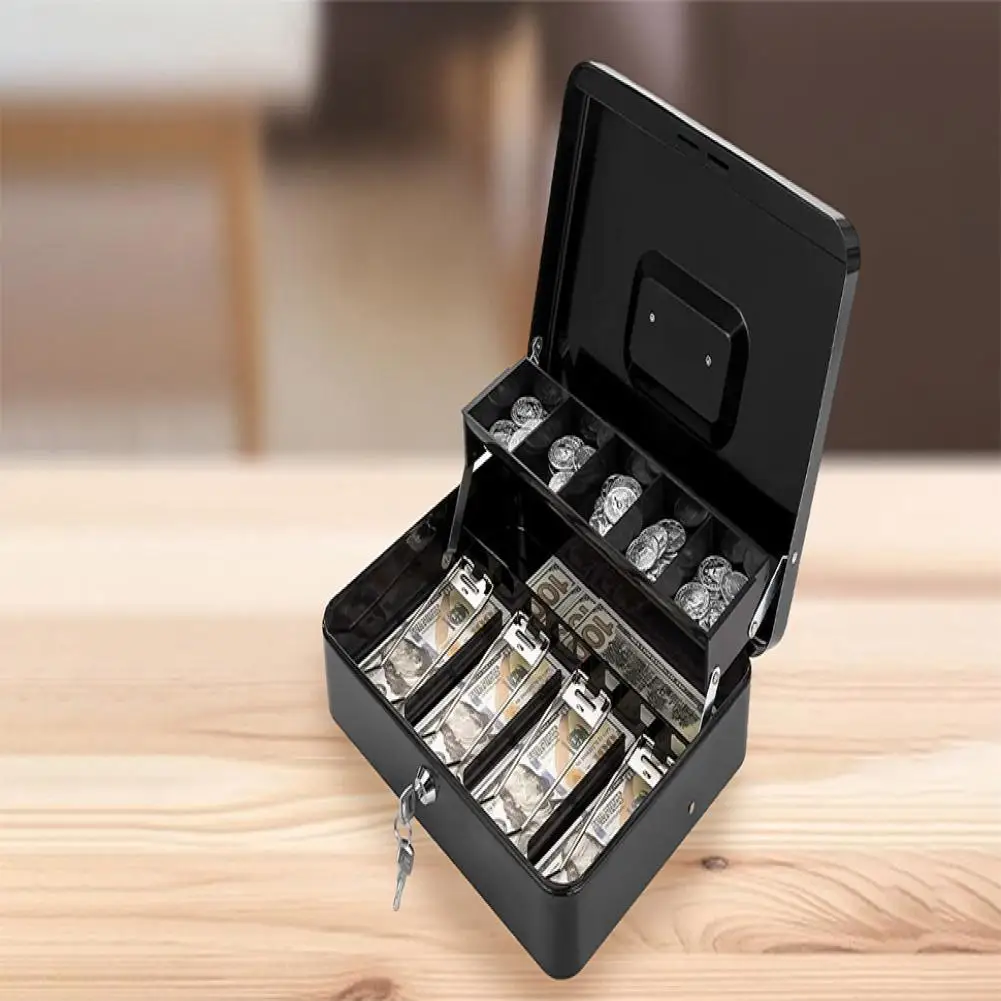 حافظ على أمانك وأمتعتك الثمينة مع صندوق تخزين النقد القابل للقفل. يتميز صندوق المال بصينية ناتئة مع 5 أقسام ، ومفصلات زنبرك متينة ، وفواصل لتنظيم سهل.