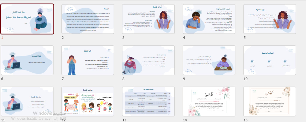يحتوي الملف على خطة توعوية متكاملة، أنشطة تفاعلية، ومواد جاهزة للعرض تساعد في الحد من التنمّر بجميع أنواعه وبناء بيئة مدرسية آمنة ومحفّزة.