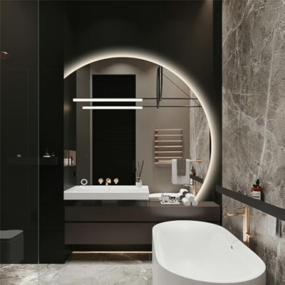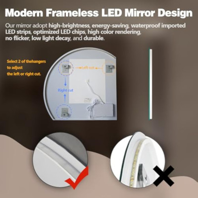 43 مرآة LED نصف قمر للحمام، مرآة بدون إطار شبه دائرية بإضاءة خلفية للمدخل، مرآة مضاءة مستديرة غير منتظمة 1/4 واي فاي