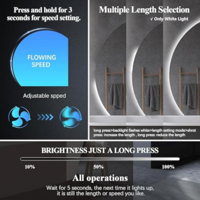 【تصميم مرآة حديث بدون إطار】مرآة زينة أنيقة غير منتظمة بتصميم شبه دائري على شكل مروحة، وديكور منزلي خاص، يكسر الجمال التقليدي لمرايا LED المستطيلة والمستديرة، ويعزز مساحتك الداخلية. 【إعدادات الإضاءة الجديدة】 يمكننا اختيار السرعة المناسبة وطول مصباح الماء الجاري وفقًا لاحتياجاتنا الخاصة. إعداد سرعة ضوء الماء المتدفق: هناك أربعة مستويات للسرعة: 1. السرعة المنخفضة 2. السرعة المتوسطة 3. السرعة العالية 4. الضوء المتدفق غير المائي. علاوة على ذلك، اضغط لفترة قصيرة على مستشعر اللمس لزيادة الطول خطوة بخطوة، واضغط لفترة طويلة لتقليل الطول. تأكيد بعد ذلك، لا تضغط وانتظر 5 ثوانٍ، سيتم حفظ إعداد الطول تلقائيًا. 【مضادة للضباب والكسر】تتميز مرايا الحمام المستديرة بوظيفة مضادة للضباب تحافظ دائمًا على صورة عاكسة واضحة. مرآة فضية عالية الدقة من النحاس مقاس 5 مم، ليس من السهل أكسدتها، تصوير واضح دون تشوه. مع طبقة عالية الجودة مقاومة للانفجار، سوف تتناثر عند كسرها. ملاحظة: يتم إيقاف تشغيل وظيفة مكافحة الضباب تلقائيًا بعد ساعة واحدة. 【رضا بنسبة 100%】 نظرًا لأن مرايا LED نصف المستديرة هي عناصر هشة ويصعب التحكم فيها في الشحن. اتصل بنا للحصول على مرآة نصف دائرية تالفة عند الوصول، بدون إرجاع، ما عليك القيام به هو إرسال بعض الصور إلينا عبر أمازون. إذا كنت غير راضٍ عن التفاصيل أو الوظائف الأخرى، فيمكنك أيضًا الاتصال بنا. 【جودة عالية】عمر LED: 50,000 ساعة (باستخدام مرآة LED نصف دائرية 3 ساعات يوميًا يعني أنها ستستمر 45 عامًا). يضمن تصنيف IP65 المقاوم للماء إضاءة آمنة في بيئات الحمام الرطبة. اعتماد شرائط LED مستوردة عالية السطوع، موفرة للطاقة، مقاومة للماء، رقائق LED محسنة، تجسيد ألوان عالي، بدون وميض، تسوس منخفض الإضاءة، ومتينة.