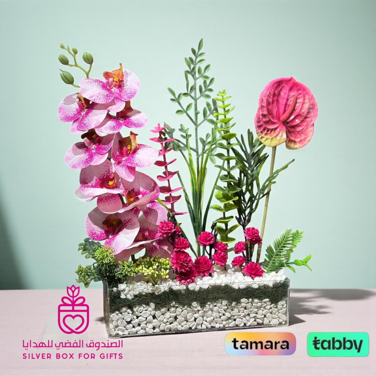 أضف لمسة من الأناقة الدائمة إلى أي مكان مع هذا الترتيب الزهري الصناعي الفاخر. يتميز بتوليفة لونية ساحرة من زهور الأوركيد الوردي المذهلة (Phalaenopsis) وزهرة الأنتوريوم (Anthurium) الوردية الداكنة المميزة، محاطة بمجموعة متنوعة من الخضروات والنباتات الصناعية التي تمنحها مظهراً طبيعياً وحيوياً.