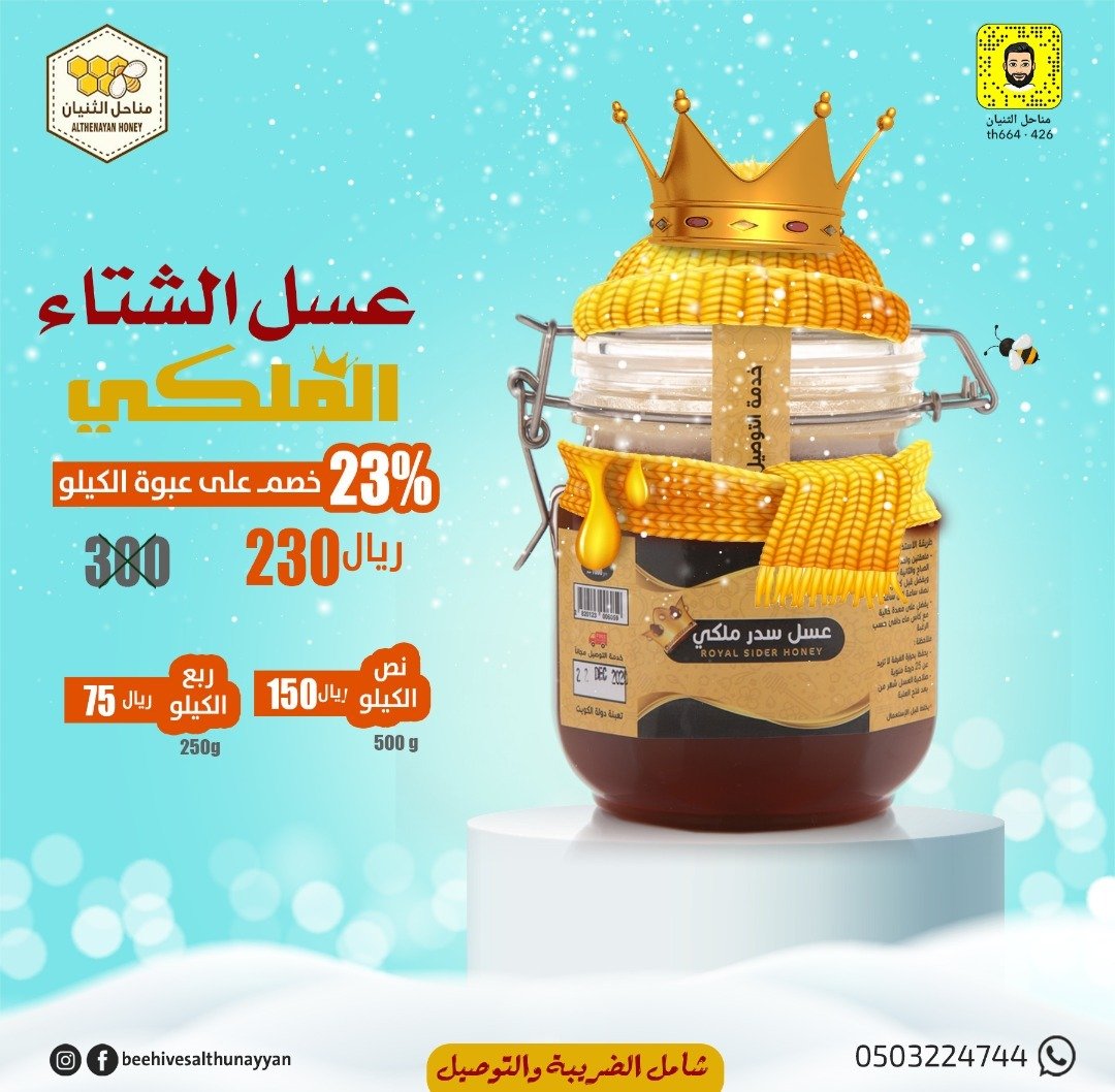 استعد لمواجهة فصل الشتاء بقوة ونشاط، اختر عسل الشتاء الملكي لتجربة فريدة من نوعها تجمع بين الطعم الرائع والفوائد الصحية الاستثنائية."