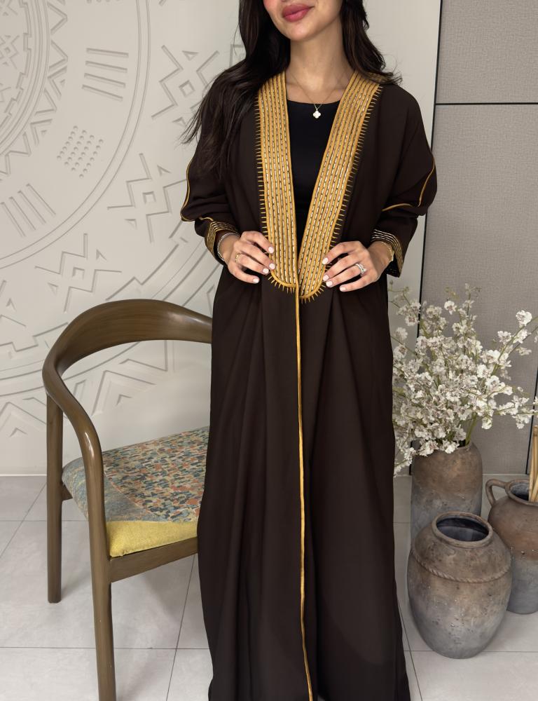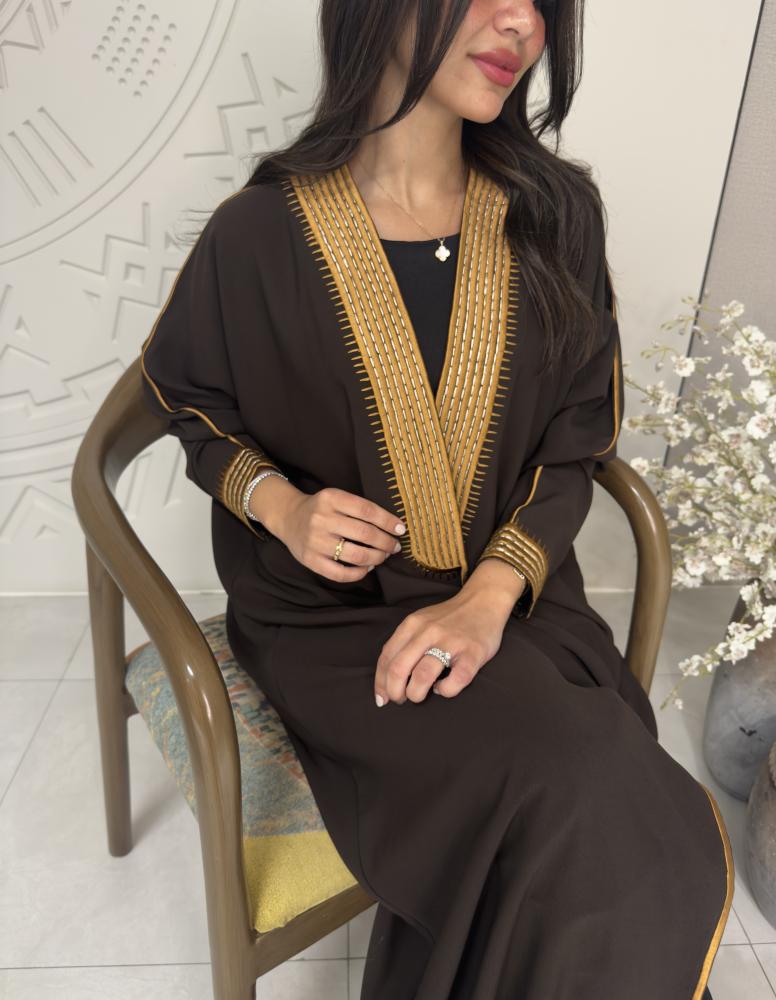 عباية بقماش كريب بني غمق بتطريز يدوي بخيط خزف ذهبي وخيط ابيض عادي داخلي) .