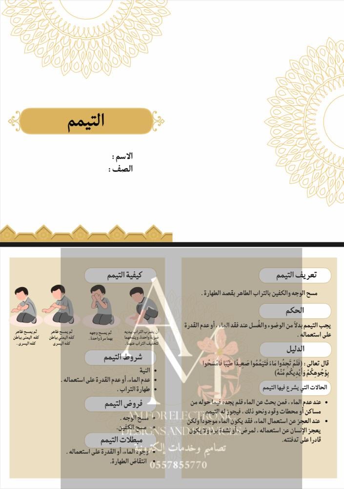 مطوية التيمم أول متوسط دراسات إسلامية ، عبارة عن صفحتين تنطبع في ورقة واحدة A4 من الأمام والخلف ثم تنطوي من المنتصف ، يتم تسليم الملف فورًا بعد الشراء.